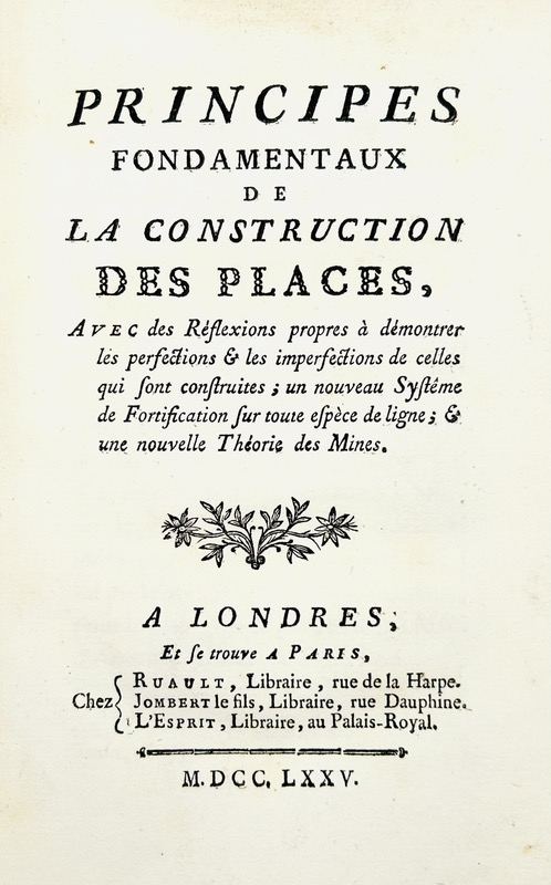 Édition originale française traduite de l’italien de Papacino d’Antoni (1714-1786) par Gratien-Jean-Baptiste-Louis Flavigny (1740-1783) – illustrée de 7 planches dépliantes. Exemplaire sur papier fort. « Pour ne rien laisser à désirer, on voudrait donner au Militaire une histoire raisonnée des différents progrès de la fortification, par le Plan ; par l’exposé des principaux systèmes dans l’ordre où ils ont paru successivement ; & par une courte digression sur les avantages et sur les désavantages de chacun d’eux. Il y a deux cents systèmes principaux, auxquels se rapporte tout ce qui a été inventé jusqu’ici sur la fortification : leur plan, leur exposé, leur discussion, sont peut-être ce qu’il y a de plus propre à répandre la lumière la plus vive sur la Science de l’Ingénieur. » Du même Papacino, Flavigny avait traduit en 1773 l’Examen de la poudre. Ex dono manuscrit à l’encre du temps Traduit et donné par Mr le Vic.te de Flavigny – avec une cote en regard suivi de l’ex-libris manuscrit V.te de Flavigny en regard du faux-titre. Légères épidermures, mors et coins frottés. Bel exemplaire aux armes de Charles Claude Andrault marquis de Langeron (1720-1791). Gouverneur de Briançon puis Brest, le lieutenant général Andrault de Langeron, Chevalier de l’ordre du Saint-Esprit fut aussi un grand bibliophile amateur d’Elzévirs. Olivier Hermal Roton, 1508.