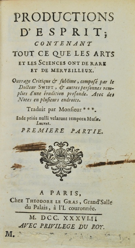 Nouvelle édition du Conte du Tonneau (La Haye, Van Effen, 1732), publié avec des remaniements et des additions par l’abbé Saunier de Beaumont. « L’éditeur de Paris l’a coupé en morceaux, qu’il a transposés, mutilés, etc… P. Baizé a su de l’abbé Saunier que, pour suppléer à ce qu’il y avait de licencieux et d’impie dans le Conte du tonneau, il avait composé la première lettre, la troisième, la dixième et la quatorzième ». Barbier III, 1056d. Mors fendu sur quelques centimètres, traces d’encres et petit manque de papier sur la page de titre.