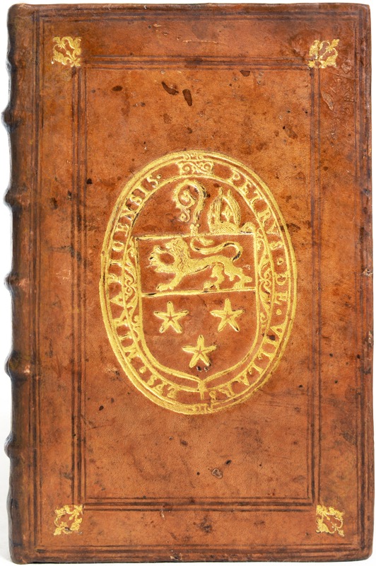 Petit in-8 (16 x 10,5 cm) de (8)-258-(1) ff. (sign. a8, 2a8, b-z8, A-I8, K3) veau fauve, dos à nerfs orné de fleurons, armes dorées sur les plats dans un double encadrement de filets à froid, fleurons dans les angles (reliure de l’époque).