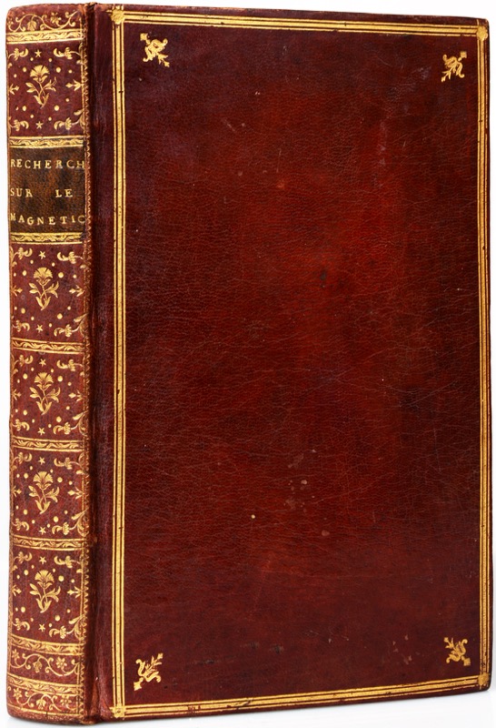 In-8 de VIII-206 pp., 8 planches dépliantes, maroquin rouge, dos lisse orné, pièce de titre en maroquin vert, triple filet doré en encadrement sur les plats, fers dorés aux angles, tranches dorées (reliure de l’époque).