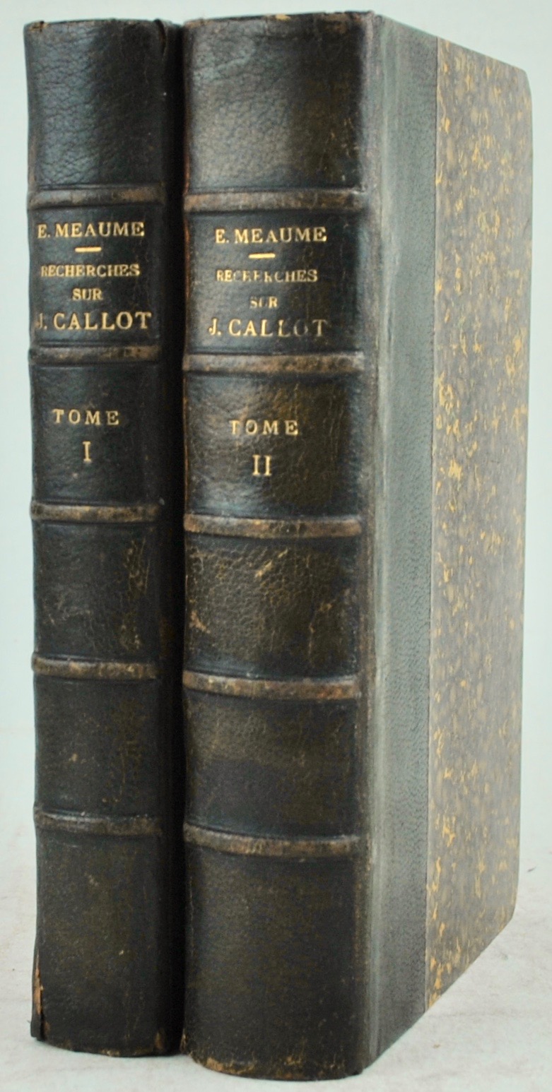 Rare réunion en édition originale des deux tomes publiés séparément, le premier en 1853 (ici avec titre de relais à la date de 1860), le second en 1860 chez la veuve Jules Renouard, sortis des presses de Grimblot et veuve Raybois à Nancy. Divisé en trois parties dont I. la biographie de Callot suivie de nombreuses notes et pièces justificatives ; II. le catalogue de l’oeuvre de Callot « réduit aux morceaux authentiques » ; III. la troisième partie divisée en cinq sections 1. Pièces douteuses 2. Pièces faussement attribuées à callot par Gersaint, Regnault-Delalande et autres 3. Pièces gravées par différents artistes d’après les dessins du maître 4. les Imitations 5. les copies classées d’après l’ordre adopté pour le catalogue de l’oeuvre. Fac similé d’autographe de Callot, tableau généalogique de la famille Callot, et planche de la marque des papiers sur lesquels ont été tirées les épreuves du « Combat à la barrière”. Exemplaire sur papier Hollande truffé d’un portrait en frontispice de Jacques Callot (Yves 1855) dans une reliure signée David. Provenance : bibliothèque du libraire new-yorkais Hans Peter Kraus (ex-libris) qui ouvrit sa première librairie à Vienne en 1932, avant de l’installer à New York en 1939. Dos frottés, coiffe de pied arasée (tome I). Vicaire, V, 635-636.