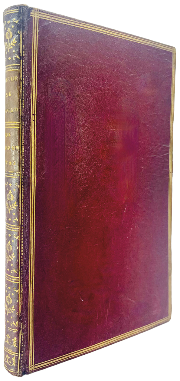 In-8 de VII-(1)-115-(3) pp., errata, maroquin rouge, dos lisse orné, pièces de titre en maroquin vert, triple filet doré d’encadrement sur les plats, tranches dorées sur marbrure (reliure de l’époque).