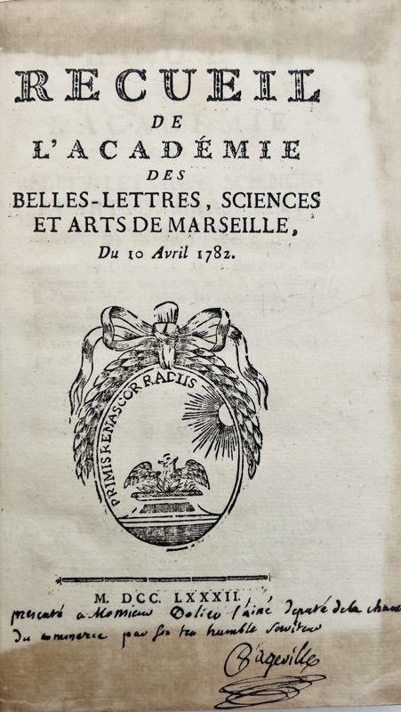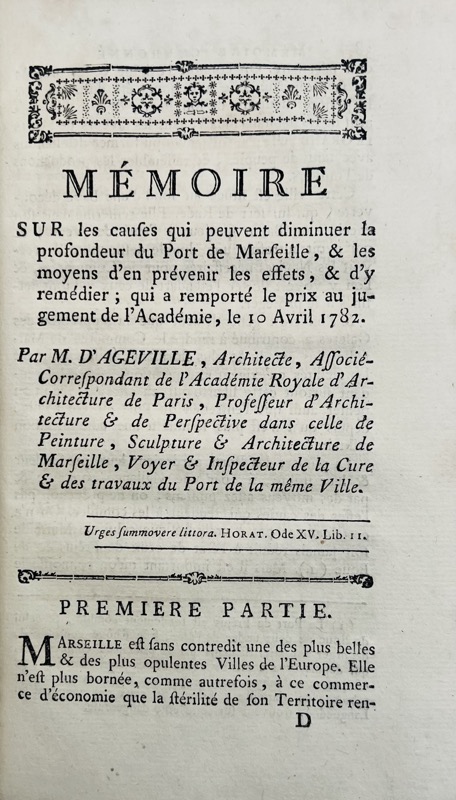 Édition originale rare. Envoi autographe signé du lauréat accompagné de quelques corrections de la même main dans le texte : Présenté à Monsieur Dolieu l’aîné député de la Chambre de commerce par son très humble serviteur d’Ageville. Recueil de deux mémoires consacrés au curage du port couronnés en 1782 par l’Académie de Marseille, précédés de deux discours prononcés par le directeur de l’Oratoire, M. Papon, le premier « à l’ouverture de la séance publique tenue le 10 décembre 1781 à l’occasion de la fête séculaire, établie par l’Académie, en mémoire de la réunion de la Provence à la couronne » ; le second à l’ouverture de la séance publique de l’Académie, pour la partie des Sciences le 10 avril 1782. Contient : Mémoire sur les causes qui peuvent diminuer la profondeur du port de Marseille et les moyens d’en prévenir les effets, et d’y remédier qui a remporté le prix au jugement de l’Académie, le 10 avril 1782 par M. d’Ageville architecte, professeur d’architecture de l’Académie de peinture. Observations sur l’usage que l’on peut faire des immondices extraites du Port de Marseille, en les employant comme fumier et engrais, propres à la fertilisation des terres, par le même. Mémoire sur le même sujet, qui a obtenu l’accessit, par M. Gautier fils (François-Jules Gautier de Marseille, associé-architecte). Bel exemplaire conservé dans sa première reliure en maroquin rouge.