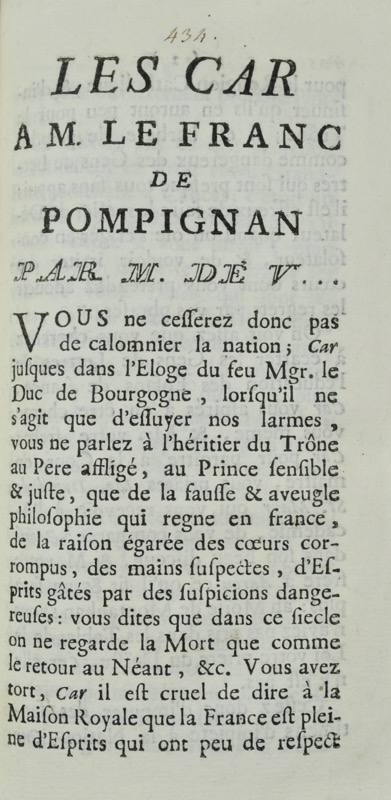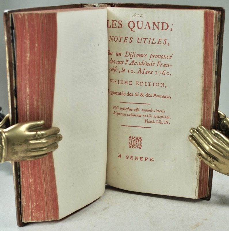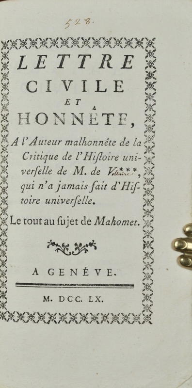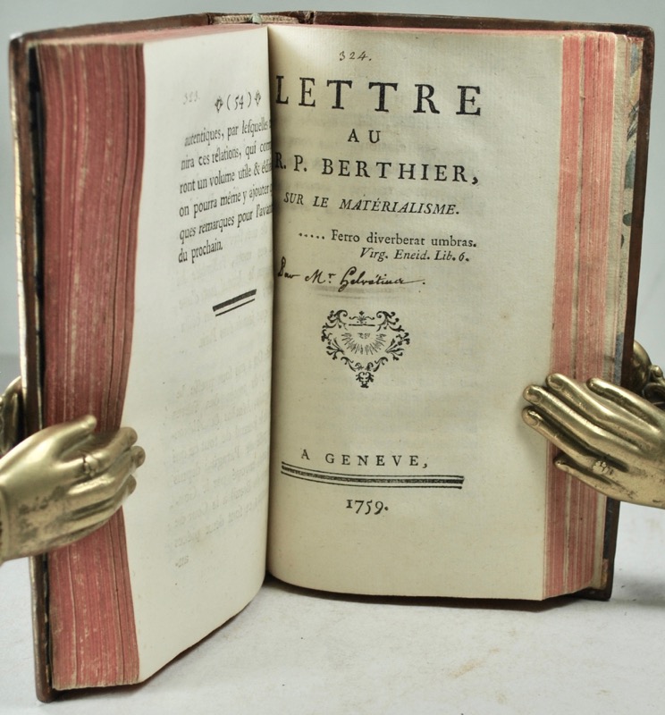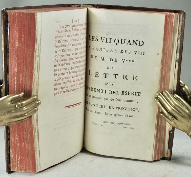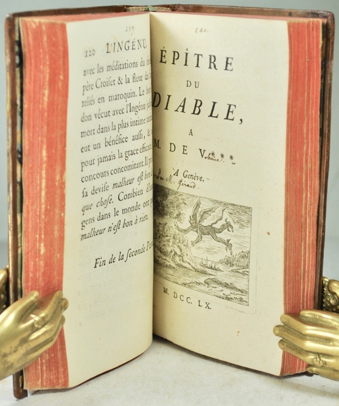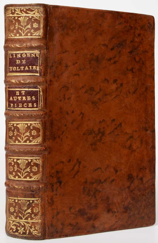 Recueil annoté à l’encre du temps, précédé d’une table des titres manuscrite. Toutes les pièces sont de Voltaire, sauf mention contraire. 1.VOLTAIRE. Le Huron, ou l’Ingénu. Seconde édition. À Lausanne, 1767 (Paris, Lacombe). 2 parties en 1 vol. in-12 de (2)-118-120 pp. Deuxième édition publiée l’année de l’originale, la première sous le titre du Huron. Relié sans les deux faux-titres (parties I et II). L’Oeuvre imprimé de Voltaire à la Bibliothèque Nationale, 2824 ; Bengesco, n° 1471. 2. [GIRAUD (Claude Marie)]. Épître du diable à M. de V***. A Genève. Sans lieu, 1760. In-12 de 21 pp. Edition originale. Vignette gravée sur le titre. Bengesco, 2330. 3. VOLTAIRE. Réponse de M. de Voltaire aux Épîtres du Diable. Sans lieu, 1762. In-12 de 8 pp. Deuxièmé édition. Relié sans le feuillet de titre. Oeuvre imprimé, 5575 ; Bengesco, 2330 4. VOLTAIRE. Relation de la maladie, de la confession, de la mort et de l’apparition du jésuite Bertier, avec la Rélation du voyage de Frère Garassise, et ce qui s’ensuit, en attendant ce qui s’ensuivra. Sans lieu (Genève, Cramer), 1760. In-12 de 54 pp. Troisième édition. Facétie qu’on attribua aussi à Grimm mais qui est bien de Voltaire. L’Oeuvre imprimé de V., 3882 ; Bengesco,1641. 5. [COYER (Gabriel-François)]. Lettre au R. P. Berthier, sur le matérialisme. A Geneve (Paris), 1759. In-12 de 77 pp. Edition originale. 6. VOLTAIRE. Les Quand, notes utiles, sur un discours prononcé devant l’Académie françoise, le 10 mars 1760. Sixième édition, augmentée des Si et des Pourquoi (de l’abbé Morellet). À Genève, (1760). In-12 de 20 pp. Contrefaçon imprimée en rouge, vraisemblablement lyonnaise car imprimée sur papier du Forez. Libelle dirigé contre Le Franc de Pompignan. L’Oeuvre imprimé de V., 3900 ; Bengesco, 1644. 7. VOLTAIRE. Les VII « quand » en manière des VIII de M. de V***, ou Lettre d’un apprenti bel-esprit qui ne manque pas de sens commun, à M. son père, en province, pour lui donner bonne opinion de lui. S.l.n.d. (1760). In-12 de 11 pp. L’Oeuvre imprimé de V., 3906. 8. VOLTAIRE. Les Car, à M. Le Franc de Pompignan. Par M. de V… S.l.n.d. (Genève, Cramer, 1761). In-16 de 4 pp. Premier tirage. Titre de départ seulement. Écrit à l’occasion de la publication par Le Franc de Pompignan de l’Éloge historique de Mgr le duc de Bourgogne (Paris, 1761). L’Oeuvre imprimé de V., 3882 ; Bengesco,1665. 9. VOLTAIRE. Le Codicile de Monsieur de Voltaire, trouvé dans ses papiers après son décès. Genève, 1762. In-12 de 13 pp. Edition originale. Oeuvre imprimé, 5434 ; Bengesco, 2385, 2. 10. VOLTAIRE. Le Russe à Paris. Sans lieu, 1760. In-12 de 16 pp. Tirage publié l’année de l’originale. Le titre de départ indique petit poème en vers alexandrins, composé à Paris au mois de mai 1760 par M. Ivan Alethof, secrétaire de l’ambassade russe. Le poème est suivi de notes. L’Oeuvre imprimé de V., 2382 ; Bengesco, 688. 11. VOLTAIRE. Lettre de M. de Voltaire, de l’Académie Française, à M. l’abbé d’Olivet, chancelier de la même Académie au Château de Ferney, 20 août 1761. S.l.n.d. (Paris, 1761). In-12 de 15 pp. Tirage parisien publié l’année de l’originale. Titre de départ. Au sujet du Commentaire sur Corneille, des conditions de souscription et des principaux souscripteurs. L’Oeuvre imprimé de V., 5033 ; Bengesco, 1937. 12. VOLTAIRE. [Oeuvres mêlées d’un auteur célèbre, qui s’est retiré de France. Berlin (Paris), 1753.] In-12 de 45 pp. Tirage inconnu de Bengesco et l’Oeuvre imprimé de V. – relié sans la page de titre. Recueil à pagination continue, qui contient : Diatribe du Docteur Akakia ; Décret de l’Inquisition, et Rapport des professeurs de Rome, au sujet d’un prétendu président, Le Jugement des professeurs du Collège de la sapience ; Défense de Milord Bollingbroke, par le Docteur Good Natur’d Wellwisher, chapelain du comte de Chesterfield, traduit de l’anglois. L’Oeuvre imprimé de V., 3869 et Bengesco, 2180 pour un tirage de 60 pp. 13. VOLTAIRE. Lettre civile et honnête à l’auteur malhonnête de la Critique de l’Histoire universelle de M. de V*** », qui n’a jamais fait d’Histoire universelle, le tout au sujet de Mahomet. À Genève, 1760. In-12 de 44 pp., titre encadré. Edition originale. Réponse à l’ouvrage anonyme Critique de l’Histoire universelle de M. de Voltaire, au sujet de Mahomet et du mahométisme. L’Oeuvre imprimé de V., 5033 ; Bengesco, 3897.