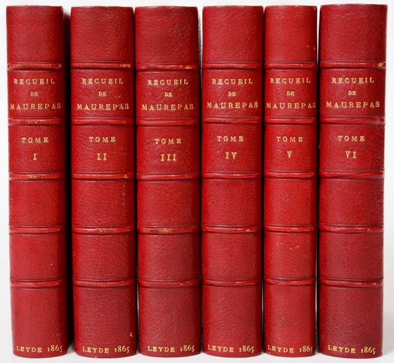 Édition originale tirée à 116 exemplaires, publiée en 1865 à Bruxelles par Poulet-Malassis. Titre en rouge et noir. Choix de pièces attribué à Jules Gay qu’il tira de l’important recueil de manuscrits commandé par le comte de Maurepas, ministre de Louis XV, qui avait fait établir une copie du recueil composé d’une quarantaine de volumes par le généalogiste Pierre de Clairambault. Ainsi que l’avertissement l’explique, un grand nombre de panégyriques et de dissertations ennuyeuses en ont été écartées au profit d’une littérature frivole et spirituelle de satires piquantes. Très bel exemplaire sur vergé de Hollande. Vicaire, VI, 994 ; Gay-Lemonnyer III, 979 ; Pia, 1257.