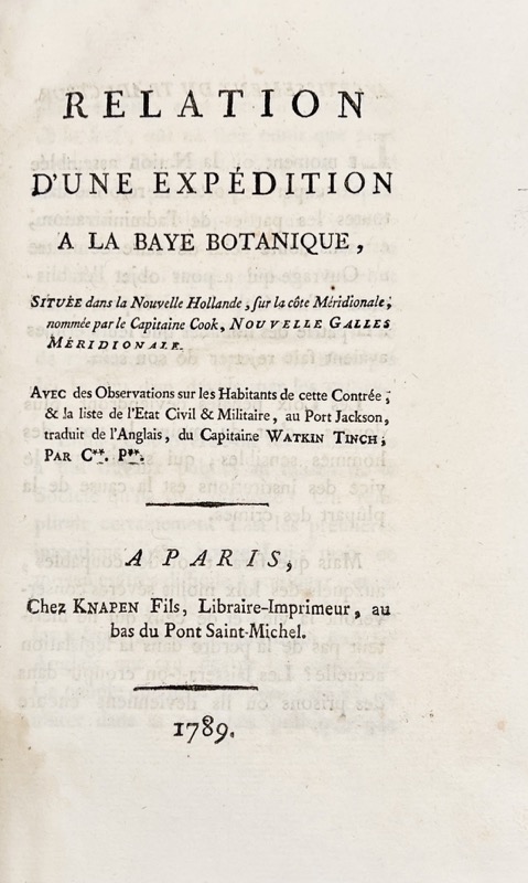 Première édition française publiée l’année de l’originale anglaise. Texte fondateur pour l’histoire de la colonisation de l’Australie, traduite par Charles Pougens (1755-1833). Officier de la marine britannique, Watkin Tench (1758-1833) parti d’Angleterre en mai 1787 arrive en Australie à bord de la Charlotte, accompagnant un convoi de 730 condamnés envoyé à Port-Jackson pour y fonder une colonie sous l’autorité d’Arthur Phillip. Son voyage passa par le Brésil et le cap de Bonne-Espérance ; il rencontra les navires de La Pérouse qui quittaient la Baie Botanique en mars 1788, quelques semaines avant leur disparition près des îles de Vanikoro. L’inauguration et l’organisation de la colonie formée à Sydney-Cove (ainsi baptisée en l’honneur du vicomte de Sydney, alors ministre de l’Intérieur britannique), les rencontres avec les Aborigènes et les conseils aux futurs colons furent relatés dans cette Relation d’une expédition à la baye botanique publiée la même année que le Voyage à la Baie Botanique, deux ouvrages que Tench consacra à ses voyages en Nouvelle-Galles du Sud, publiés la même année et rapidement considérés parmi les meilleurs des récits contemporains. Très bon exemplaire. Nombreuses erreurs de pagination dans le cahier A sans manque, petits accidents sur le second plat. Conlon, 89.11053 ; Boucher de la Richarderie, VI, 419 ; Chadenat, 4408 ; Ferguson, 54.