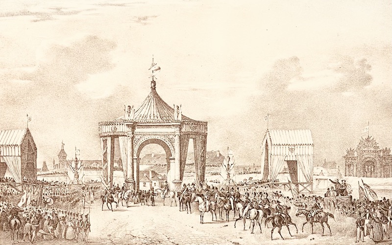 Édition originale illustrée d’une carte routière du voyage et de sept planches lithographiées en noir par Victor Adam, Bonington, Deroy, Sabatier : Entrée de S.M. dans l’arrondissement de Cambrai, Vue de la Fontaine de Douai, Entrée de S.M. à Lille le 7 septembre 1827, Tribune élevée pour S.M. à Lille, Sa Majesté à l’Hôtel de ville d’Hazebrouck, Chasses des Écluses de Dunkerque, Médailles frappées à l’occasion du Voyage de S.M. Rousseurs, traces de mouillures sur les plats de couverture, petit accroc sur la pièce de titre. Ruggieri, n°657.