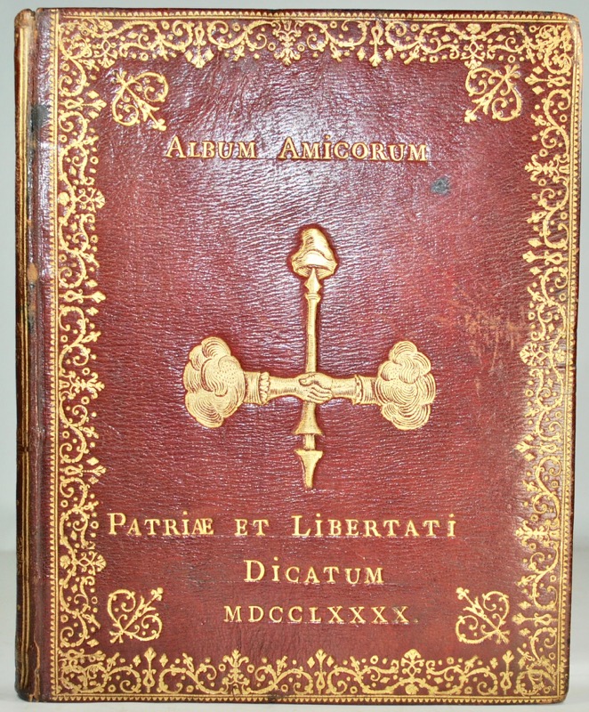 Spectaculaire et rare reliure en maroquin rouge à l’emblème révolutionnaire établie sur un livre blanc : une poignée de main qui enserre une lance surmontée du bonnet phrygien – premier symbole révolutionnaire, accompagné de la devise Album amicorum patriae et libertati dicatum MDCCLXXXX (Livre des amis dédié à la Patrie et à la Liberté 1790). Tradition issue du XVIe siècle, l’album amicorum était destiné à recueillir témoignages écrits, dessins, poèmes, marques d’affections diverses de proches, amis, autorités etc. Des artistes ou des amateurs d’art ont perpétué cette tradition les siècles suivants, avec un net regain en cette fin de XVIIIe siècle. L’album amicorum peut être aussi un recueil d’articles édité par les disciples d’un professeur ou d’un maître. Étiquette ancienne « Chaulin & C. Md papetier des bureaux du roi successeur de M. Dubois, rue saint-Honoré, au coin de celle d’Orléans ».