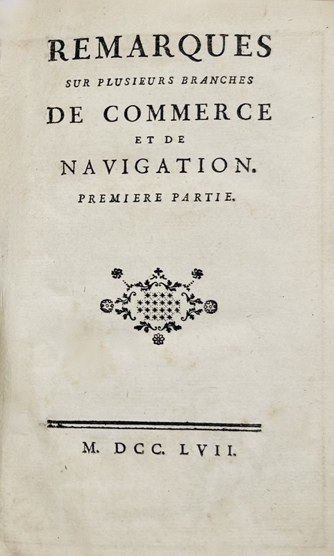 Édition originale. O’Heguerty, comte de Magnières, d’origine irlandaise, était devenu directeur général du commerce, président du conseil supérieur et gouverneur de l’île Bourbon ; il avait francisé son nom en d’Heguerty. L’auteur souligne l’importance de la découverte du nouveau monde dans les échanges commerciaux et notamment dans le développement du commerce maritime. Il remarque son infériorité en France par rapport à l’Angleterre et à la Hollande. Il insiste sur l’importance du métier de négociant et sur la nécessité d’établir une flotte marchande en France. Il examine les différentes branches de commerce entreprises par les armateurs, puis les moyens de les développer : culture des terres ; commerce des grains dont l’exportation doit être autorisé ; pêcheries, commerce du Levant. « Économique. Sur la culture des terres, le commerce des grains (dont il faut permettre et encourager l »exportation), les pêcheries et le commerce du Levant (ces derniers points très détaillés) » INED. Quelques rousseurs. Kress, 5636 ; Goldsmiths, 9247 ; INED, 3411 ; Higgs, 1464.