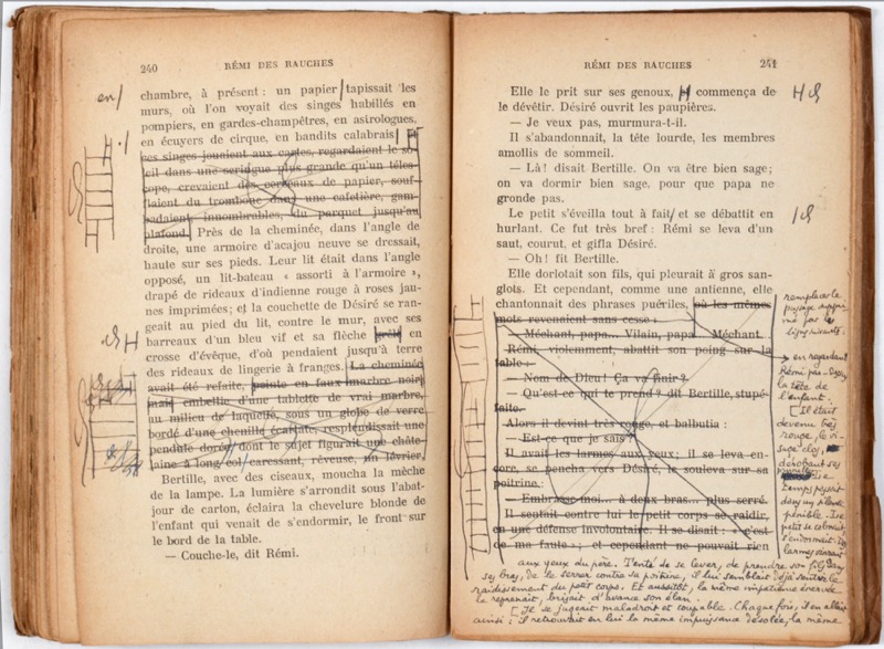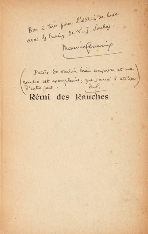 Édition originale. Exemplaire d’épreuves abondamment corrigé. Sur le faux-titre, de la main de Maurice Genevoix : Bon à tirer pour l’édition de luxe avec le burin de L-J Soulas. Maurice Genevoix. (Prière de vouloir bien conserver et me rendre cet exemplaire, que j’aurai à utiliser d’autre part. MG). Sur la couverture, cette note manuscrite : Monsieur Maurice Genevoix Hôpital psychiatrique La Manouba Tunisie. L’édition de luxe illustrée de burins originaux de Louis-Joseph Soulas paraîtra en 1948 chez Rouam à Orléans.