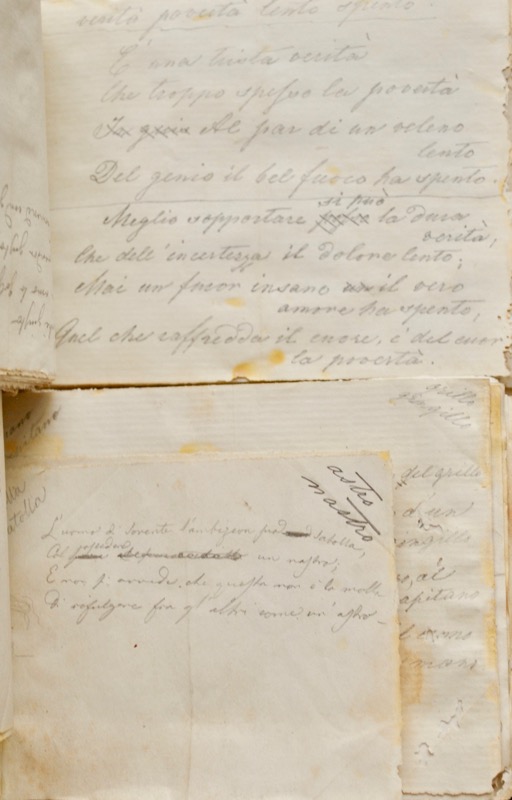 Recueil anonyme de quatrains italiens rédigés au crayon sur de petits billets recto verso, soit environ cinq cents poèmes anonymes, composés près de Paris à l’automne 1859. C’est l’année de la campagne d’Italie correspondant à la deuxième guerre d’indépendance italienne qui voit s’affronter l’armée franco-piémontaise à celle de l’empire d’Autriche. Sa conclusion permit la réunion de la Lombardie au royaume de Sardaigne et posa la base de la constitution du royaume d’Italie. Curieuse pièce d’archives qui regroupe les exercices poétiques d’un italien en exil à l’époque du Risorgimento. Étiquette A François 1er Algier rue St Honoré. Papeterie, Nouveautés.