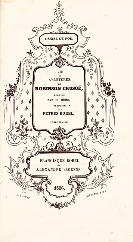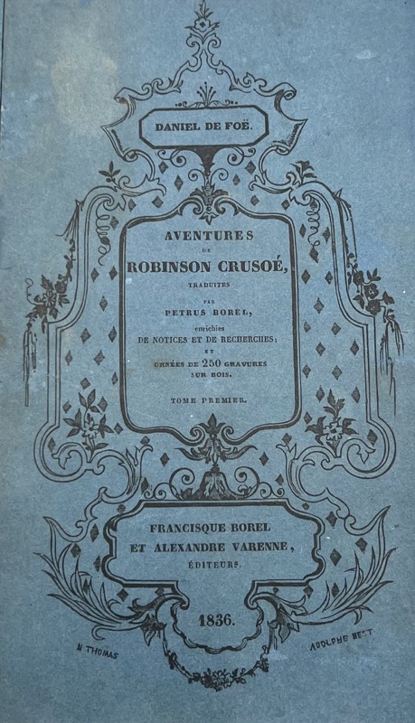 Robinson Crusoé, par Daniel De Foë. Traduction de Petrus Borel. Enrichi de la vie de Daniel de Foë Par Philarète Chasles ; de notices sur le matelot Selkirk, sur Saint-Hyacinthe, sur l'île de Juan-Fernadez, sur les Caraïbes et les Puelches, par Ferdinand Denis ; et d'une dissertation religieuse, par l'abbé La Bouderie, vicaire-général d'Avignon. Orné de 250 gravures sur bois.
