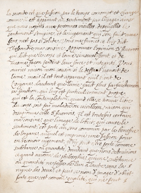 Roman édifiant du XVIIe siècle anonyme, manuscrit et probablement inédit dans lequel dialoguent la nymphe Orythie et Thessandre, deux figures mythologiques peu usitées à l’âge classique, prétexte à une dissertation sur le beau et la vertu établie sur le modèle platonicien du Phèdre. « Ayant par plusieurs fois considéré d’où était venu ce mot de beauté tant usité en ce siècle ET COMME J’ÉTAIS AU DÉSIR DE LE RECHERCHER DANS LES AUTEURS ANCIENS, un philosophe rare en doctrine et fort de mes amys, m’en apporta un discours qu’il avait tiré des vers DU POÈTE SERGIUS (Maurus Honoratus Servius ? grammairien latin du IVe siècle auteur d’une explication de la grammaire de Donat et dont le chef d’oeuvre est le commentaire des oeuvres de Virgile Ndlr) lequel je me suis résolu vous figurer. Or ce grand personnage me montra que ce nom de beauté, que les grecs ont nommé Kallon venant du verbe grec Kallo qui veut dire attirer ou être attiré, et admiré à une grande emphase parce que la beauté rend les hommes admirables en toute compagnie et assujettit les esprits de tous à vouloir du bien, à ceux qui sont doués de cette qualité, Aristote ne l’ignorait pas (…) C’est la raison qui me fait pour commencement de mon histoire vous alléguer d’où vient le nom seul propre pour la seule dont je me suis résolu vous dépeindre les aventures afin que vous jugiez comme moy que lorsque les Dieux professent ce mot, ils contemplaient leurs Idées selon l’opinion des Philosophes » (Incipit). Très rare fiction narrative non chapitrée à l’état de manuscrit établie sans rature vers 1680 et d’une parfaite lisibilité. Galerie de ver avec perte de quelques lettres. Inconnu à Lever, La Fiction narrative en prose au XVIIe dont aucun titre ne contient Orythie.