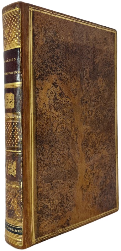 In-8 de XVI-442-(2) pp., basane havane, dos lisse orné, pièce de titre en maroquin lie-de-vin, double filet doré d’encadrement sur les plats, tranches marbrées (reliure de l’époque portant l’étiquette « relié aux sourds-muets »).