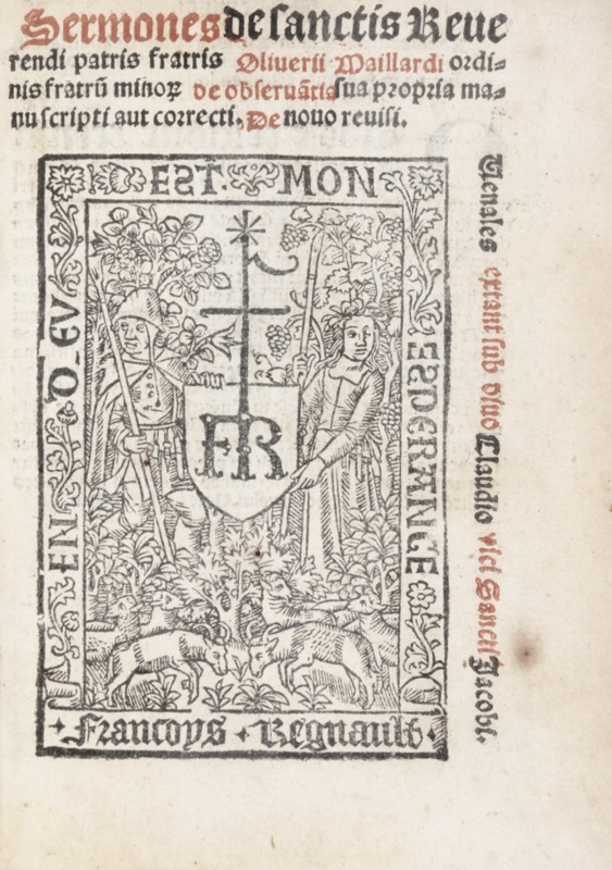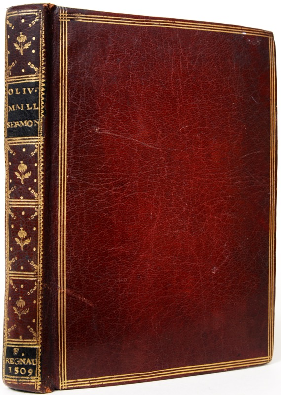 Nouvelle édition posthume imprimée sur deux colonnes en caractères gothiques des sermons pour les fêtes des saints d’Olivier Maillard (1430-1502), l’un des plus grands prédicateurs franciscains de la fin du XVe siècle, confesseur de Charles VIII dont les sermons en latin portaient sur l’Avent, le Carême, les Dimanches et fêtes etc. Les Sermones de sanctis (pour les fêtes des saints) furent publiés une première fois en 1504. Colophon: Impressorum sumptibus honesti viri Francisci Regnault. Bibliopole almeuni versitatis parisiensis. Anno domini Millesimo quingentesimo ix die vero xvi Martii (16 mars 1509). Grande marque typographique (58 x 86 mm) de François Regnault sur la page de titre imprimée en rouge et noir. L’ultime feuillet CXII qui contient au recto la table et le colophon, blanc au verso, est doublé ; l’impression de quelques feuillets est très pâle, quelques rousseurs, petite taches brunes sur le plat inférieur. Exemplaire joliment relié au XVIIIe siècle. Brunet, III, 1316 ; Moreau, Inventaire, I, 134 ; inconnu à La Borderie, Bibliographie Maillardine in Oeuvres françaises d’Olivier Maillard Nantes 1877 (éditions Jehan Petit).