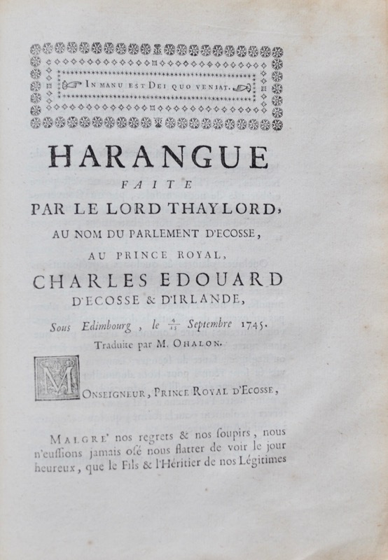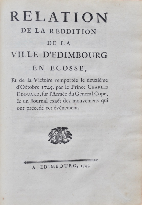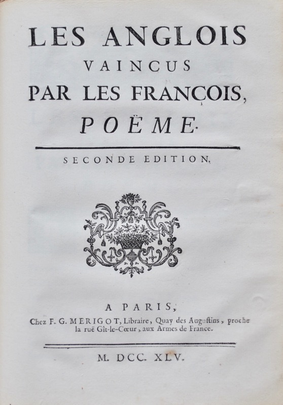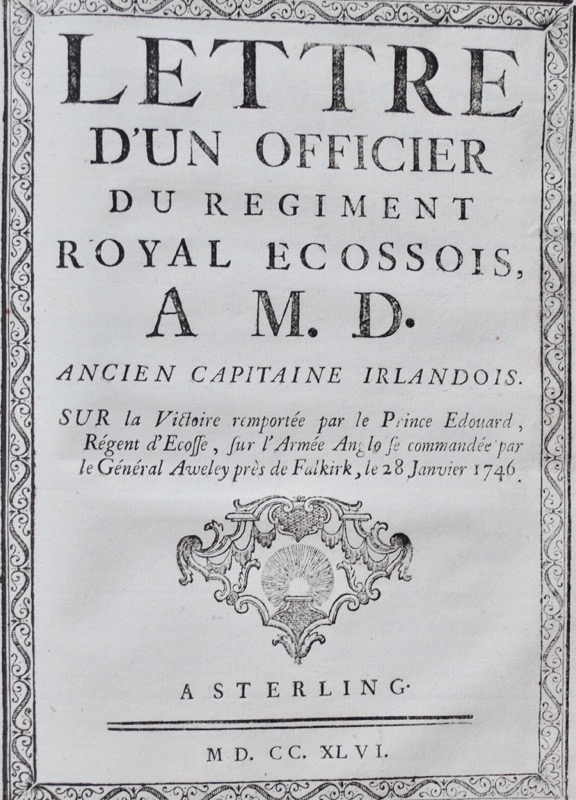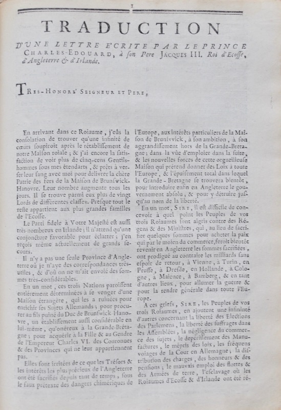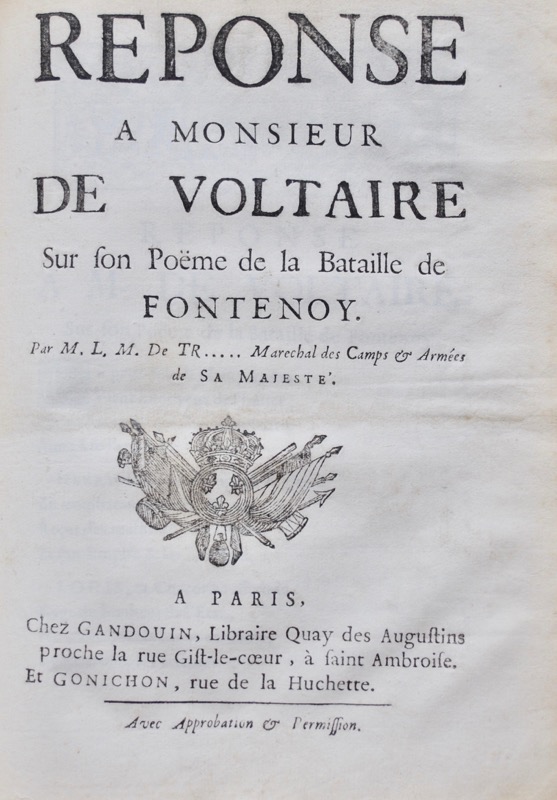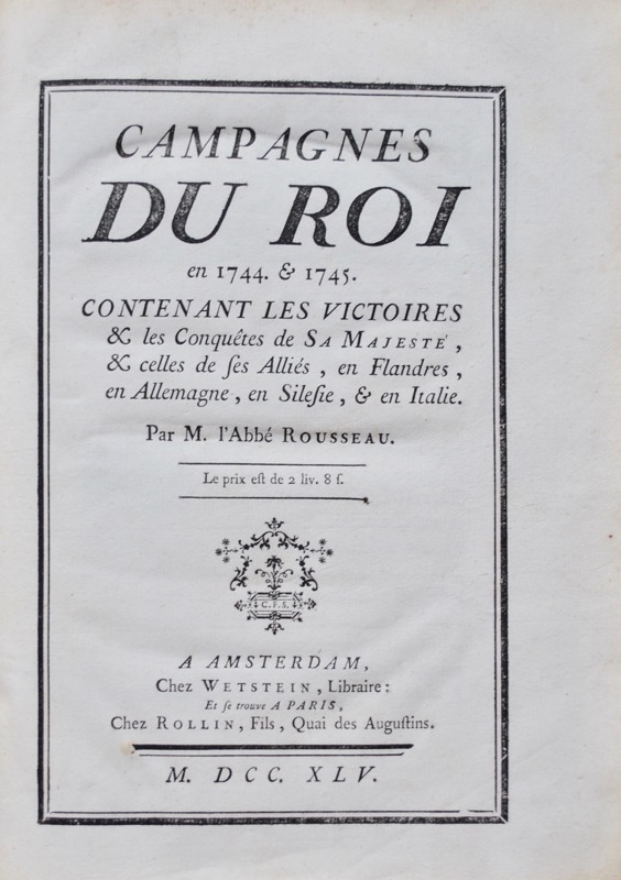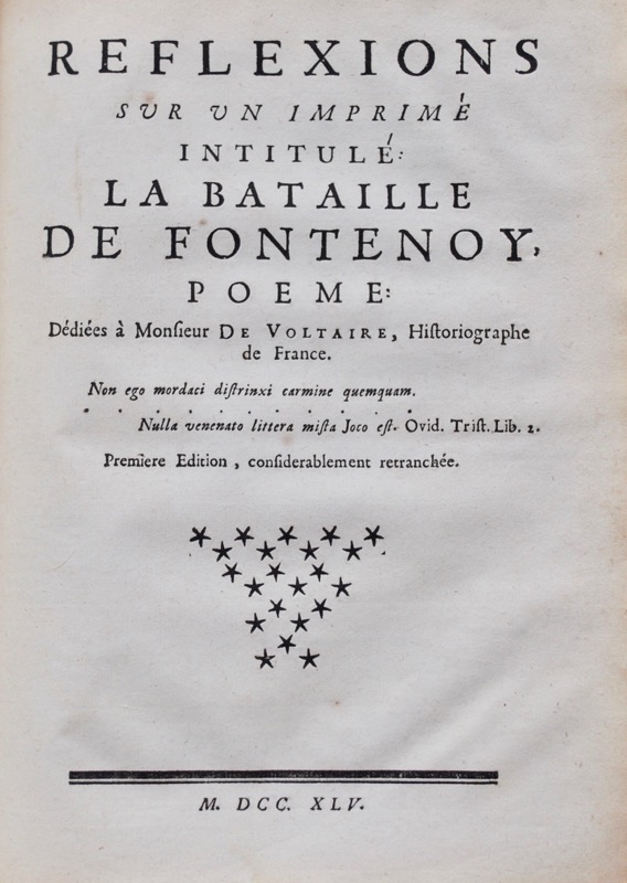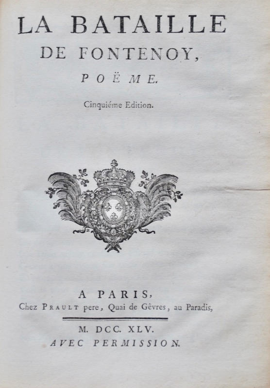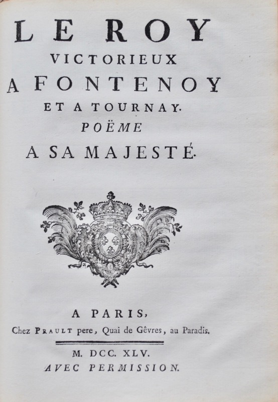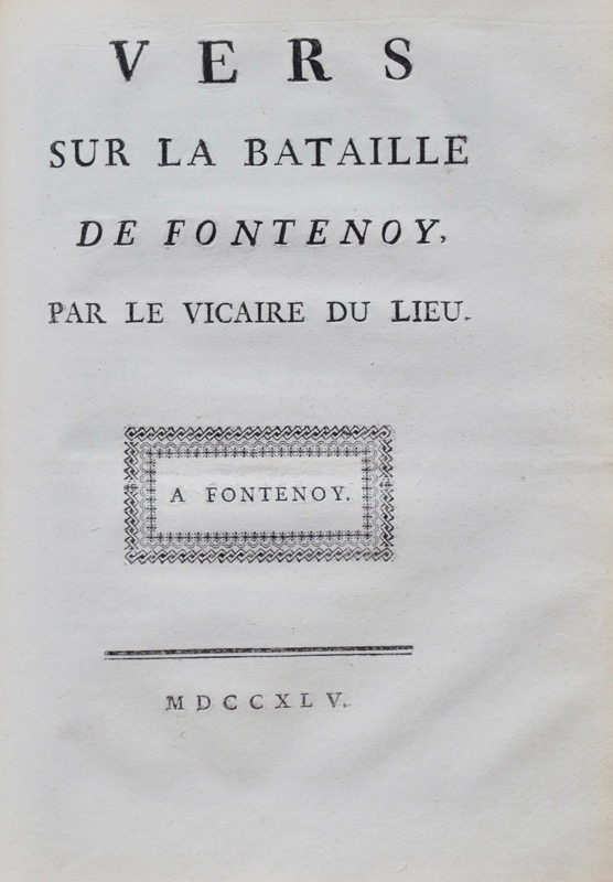 Remarquable ensemble de 42 pièces sur les campagnes de Louis XV de 1744 à 1746, notamment sa maladie, la bataille de Fontenoy, durant la guerre de succession de la maison d’Autriche disputée par quatre puissances et les événements historiques concernant le jeune prince Charles Edouard Stuart (1720-1788), prétendant aux trônes d’Angleterre, d’Écosse et d’Irlande. ROUSSEAU (Abbé). Campagnes du roi en 1744 & 1745. Contenant les victoires & les conquêtes de sa Majesté, & celles de ses alliés, en Flandres, en Allemagne, en Silésie, & en Italie. A Amsterdam, chez Wetstein et à Paris, chez Rollin fils, 1745. In-4 de (4)-122 pp. Édition originale. LAMBERT (Claude-François). Lettre d’un seigneur Hollandois à un de ses amis, à La Haye, sur le nouveau secours prêté par la Hollande à la reine de Hongrie ; Avec des éclaircissemens sur les différens intérêts des alliés de la Cour de Vienne. Sans lieu, 1744. In-4 de 16 pp. Édition originale. Ouvrage de l’abbé Lambert (1705-1765) publiés comme presque tous ses écrits sous le voile de l’anonyme. Lettre datée à la fin : A Paris le 14 août 1744. Barbier, II, 284. Lettre d’un Hollandois, à un bourgeois de Francfort, sur l’élection du grand duc de Toscane. Sans lieu ni date. In-4 de 8 pp. Lettre datée à la fin : D’Amsterdam ce 14 septembre 1745. Relation de ce qui a été observé à Strasbourg pour les Réjoüissances de la convalescence du Roy, pour son entrée & réception le cinq octobre 1744, & pendant le séjour de Sa Majesté dans cette ville. Sans lieu, (1744). In-4 de 7 pp. Suite de la relation de ce qui a été observé à Strasbourg pour les réjouissances de la convalescence du roy, pour son entrée & réception le cinq octobre 1744, & pendant le séjour de Sa Majesté dans cette ville, jusques & compris le jour de son départ. Sans lieu, (1744). In-4 de 7 pp. Lettre familière et raisonnée, A Madame de **** sur les principaux écrits qui ont paru au sujet de la Bataille de Fontenoy. A Londres, Hierosme Printall, 1745. In-8 de 54-(1) pp. Lettre datée à la fin : De Paris juillet 1745. Édition originale. Louis XV. Ode. Sans lieu, (1745). In-8 de 7 pp. Edition originale. Relation exacte et détaillée de la victoire remportée par l’armée du Roy de Prusse, Sur l’Armée combinée Autrichienne & Saxonne. A Berlin, 1745. In-4 de 8 pp. Édition originale. Relation de la campagne du roi de Prusse en Silésie de l’an 1745 et de la bataille de Friedberg gagnée par le roi sur l’armée combinée Autrichienne & Saxonne le 4 de juin 1745. A Berlin, 1745. In-8 pp. de 8 pp. 1 tableau dépliant : Ordre de bataille du 4 juin 1745 proche de Friedberg. Édition originale. Relation détaillée des opérations militaires menées avec succès par Frédéric II en personne pour une des premières victoire sur trois qui imposeront à l’Autriche la renonciation définitive à la Silésie. In fine : Liste des officiers prisonniers autrichiens. Lettre d’un Officier Prussien de l’armée du roi en Boheme, du Camp de Jürgengrund du I d’octobre, sur la Bataille qui s’est donnée le 30 Sept. à Sorr proche de Prausnitz entre l’Armée de Prusse & l’Armée combinée Autrichienne et Saxonne 1745. Sans lieu ni date (1745). In-4 de VIII pp. Edition originale. Double tableau dépliant : Ordre de bataille de l’armée de la reine de Hongtie avec les troupes auxiliaires Saxonnes, en Boheme le 30 septembre 1745 – Ordre de bataille de l’armée du roy, 30 sept. 1745. GRESSET (Jean-Baptiste-Louis). Ode sur la convalescence du Roy. A Paris, chez Bordelet, 1744. In-4 de 8 pp. Édition originale. Lu et approuvé ce 16 septembre 1744 Crébillon. Relation de la bataille de Fontenoy, Et de la Victoire que l’armée du Roy, commandée par Sa Majesté, a remportée sur l’armée des Alliez. A Paris, Au bureaux d’adresse, 1745. In-4 de 8 pp (pagination continu). Extraordinaire de la Gazette de Renaudot n°24. LA VILLE (abbé Jean Ignace de). Pièces concernant la destination des garnisons qui ont défendu Tournay et Denremonde. Sans lieu ni date. In-4 de 8 pp. Datée in fine : A La Haye le 6 d’octobre 1745. Relation exacte et détaillée envoyée à Madame L. E. D. *** par M. de ***, major du régiment de ***, contenant ce qui s’est passé à la bataille de Fontenoy, gagnée par l’armée du roi, commandée par Sa Majesté, le 11 may 1745, M. le maréchal comte de Saxe, général, commandant sous les ordres du roi. A Lille, de l’Imprimerie de la veuve de C. M. Cramé, 1745. In-4 de 8 pp. Édition originale. VOLTAIRE. La Bataille de Fontenoy, poëme. A Paris Prault pere, 1745. In-4 de 12 pp. Cinquième édition. Les cinq premières éditions in-4 du poëme de Voltaire sont sans préface et sans dédicace. De plus elles sont toutes anonymes. Bengesco, I, 164. [DROMGOLD (Jean)]. Réflexions sur un Imprimé intitulé La Bataille de Fontenoy, Poème : Par M. D.*** G.I. Dédiées à M. de Voltaire, Historiographe de France. Première Édition, considérablement retranchée. Sans lieu ,1745. In-8 de (2)-18 pp. Descendant d’une nobles familles irlandaises, Dromgold (1720-1822), mécontent que Voltaire n’eût pas, dans son poème sur la Bataille de Fontenoy, rendu plus de justice au courage des Irlandais, publia sur ce ces Réflexions critiques, qui furent d’autant mieux accueillies, que l’ouvrage de Voltaire avait un grand succès. Quérard, Les Supercheries, I, 502. [TRESSAN (Louis Elisabeth de La Vergne, comte de)]. Réponse à Monsieur de Voltaire Sur son Poëme de la Bataille de Fontenoy. A Paris chez Gandouin et Gonichon, (1745). (2)-5 pp. Édition originale. [MARCHAND (Jean-Henri)]. Requête du Curé de Fontenoy au Roy. A Fontenoy, 1745. In-8 de 8 pp. Édition originale. Vers sur la bataille de Fontenoy, par le vicaire du lieu. A Fontenoy, 1745. In-8 de 7 pp. Edition originale. [ROBBE DE BEAUVESET (Pierre-Honoré)]. Épitre du Sieur Rabot, Maître d’Ecole sur les victoires du Roi. A Fontenoy