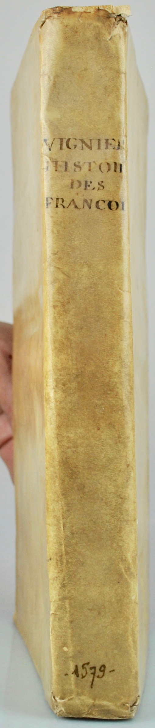 Édition originale du célèbre traité De l’origine, estat et demeure des anciens François, qui parut ensuite séparément trois ans plus tard (1582) Juriste et théologien calviniste, Nicolas Vignier né à Bar-sur-Seine (1530-1596) fut le médecin et historiographe personnel d’Henri III. Du Sommaire, Pierre Bayle écrivait : « Cet ouvrage est curieux. L’auteur y traite son sujet avec beaucoup d’exactitude, et il cite tous les bons auteurs qui ont parlé des françois et dont il a tiré beaucoup d’éclaircissement pour l’histoire ». Provenance : Godefroy de Montgrand (1822-1897), (ex-libris armorié) ; historien et homme de lettres provençal, le comte de Montgrand est l’auteur de l’Armorial de la ville de Marseille (1874) ; sa bibliothèque fut vendue à Paris en 1904. Bel exemplaire dans une séduisante reliure souple de l’époque. Galerie de ver marginale à la fin du volume, des rousseurs. Brunet, V, 1218.