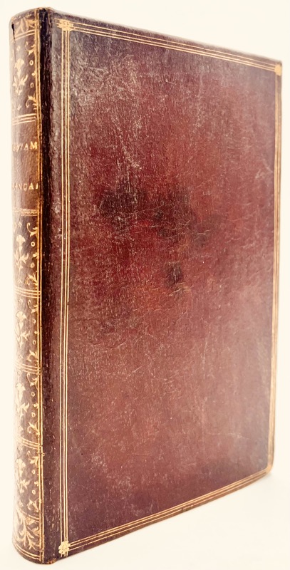 74 planches reliées en 1 vol. in-8, maroquin rouge, dos lisse orné, triple filet d’encadrement des plats, roulette sur les coupes, dentelle intérieure, tranches dorées (reliure ancienne).