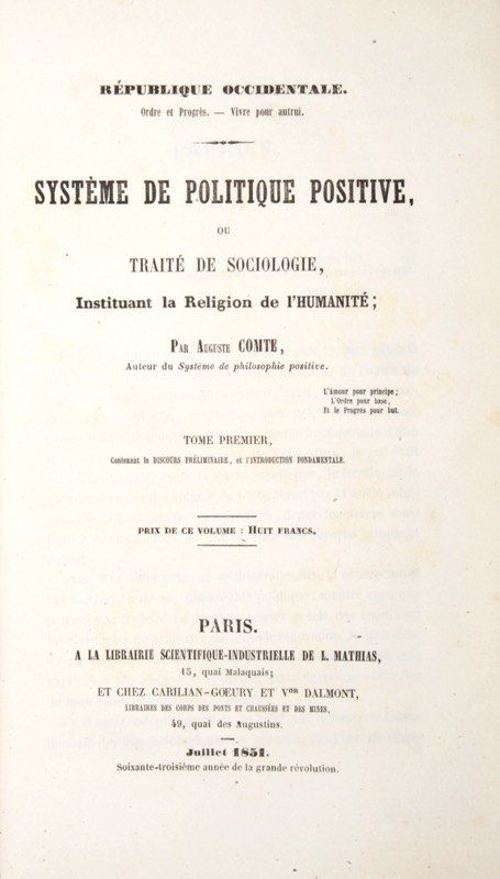 Système de politique positive, ou traité de sociologie, instituant la Religion de l'Humanité.