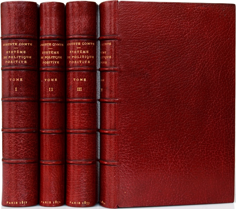 Edition originale rare. Rédigé entre 1851 et 1854, le Système de politique positive d’Auguste Comte est une oeuvre curieusement oubliée. Comte lui-même la considérait pourtant comme une étape décisive de sa pensée : il en parlait comme de sa « seconde carrière » venant parachever la première, celle constituée par le Cours de philosophie positive. Après avoir transformé la science en philosophie, Comte y entreprend de transformer la philosophie en religion de l’humanité pour constituer le positivisme complet. L’appendice au quatrième tome forme un cinquième tome donnant les écrits de l’auteur pendant sa période saint-simonienne. Très bel exemplaire dans une luxueuse reliure signée Masson et Debonnelle, successeurs de Capé, actifs de 1867 à 1885.