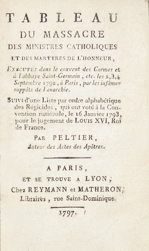 Édition originale. Tiré à part du Dernier tableau de Paris, ou Récit historique de la révolution du 10 août 1792. Pamphlétaire et fondateur des Actes des Apôtres avec Rivarol, Jean-Gabriel Peltier (1760-1825) fut obligé de s’exiler à Londres en 1792, suite à la journée du 10 Août durant laquelle son collaborateur François-Louis Suleau fut massacré. Réfugié à Londres, il anima le périodique Tableau de Paris depuis l’année 1794 jusqu’en 1802 destiné à combattre le gouvernement républicain. Tourneux I, 3493 ; La Bédoyère, 1400.