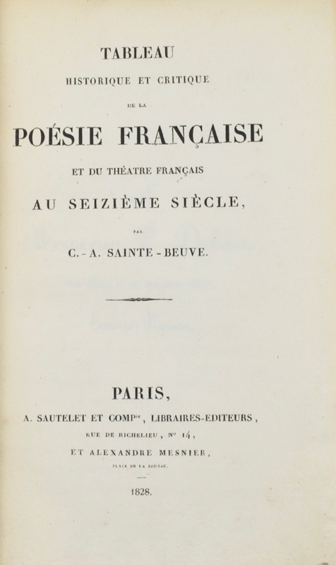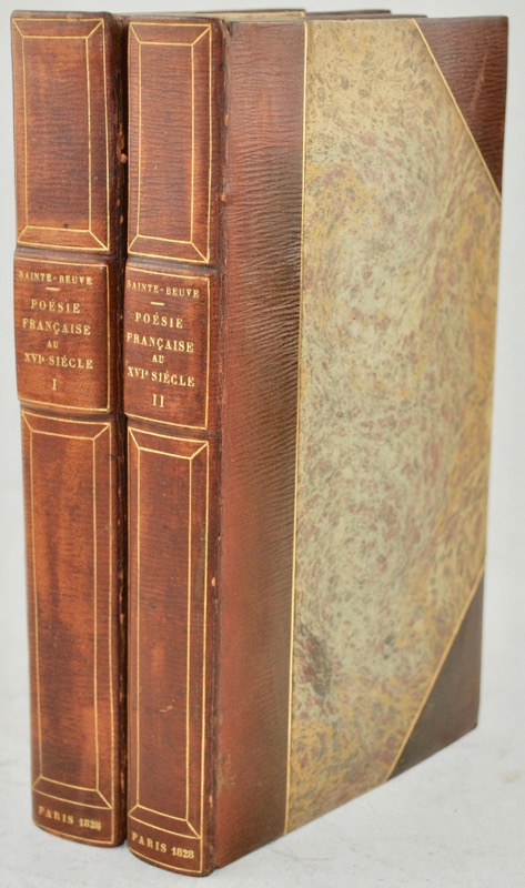 Édition originale. Première oeuvre de Sainte- Beuve (1804-1869), issu du concours que l’Académie française proposa, en 1826, pour le prix d’éloquence décerner en 1828 : L’Histoire de la langue et de la littérature française, depuis le commencement du XVIe siècle jusqu’en 1610. Prit par son sujet, Sainte-Beuve renonça de lui-même au concours, pour le traiter en toute liberté. Il écrivit une véritable étude littéraire du XVIe siècle, théâtre, poésie, roman, qui fut considéré comme le manifeste des choix littéraires de la nouvelle école romantique. Le second volume est entièrement consacré à l’oeuvres Pierre de Ronsard : Oeuvres choisies de Pierre de Ronsard, avec notice, notes et commentaires. Vicaire, VII, 114.