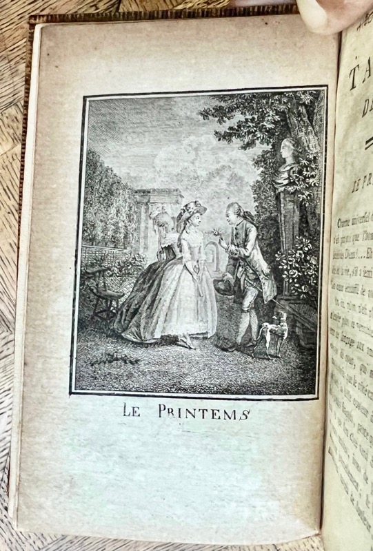 Première édition sous ce titre et de petit format du Monument du costume de Restif de La Bretonne publié en 1789 ; Restif a fait une nouvelle distribution du texte auquel il a ajouté dix-sept chapitres qui ne sont pas de sa main. Les 17 figures hors texte gravées d’après les compositions de Freudenberg et de Moreau le jeune sont la réduction des 26 planches de l’édition in-folio du Monument du costume parue en 1789. Le feuillet « Avis des Éditeurs » manque. Chiffre LF (cachet) non identifié. Rives Childs, pp. 315-318, XXXIX ; Colas, 1123 ; Lacroix, p. 336, n°1 ; Cohen-De Ricci, 880-881; Lacombe, Catalogue, 2724.