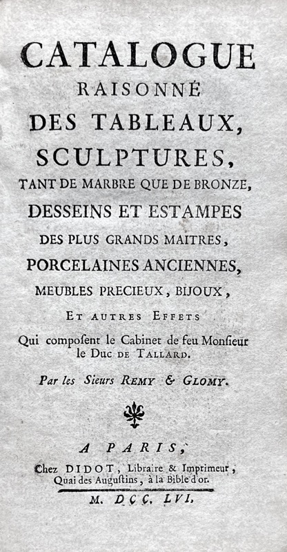 Rare catalogue de la collection du duc de Tallard (1132 numéros), complet du frontispice de Baudouin gravé par Huquier « Réunion d’amateurs » ; le frontispice sera de nouveau utilisé pour les catalogues des ventes Potier (1757), Babault (1763), Bailly (1767), Brochant (1774). Une figure hors texte (p. 236). « Vente retentissante » (Lugt, 1921, p. 190).