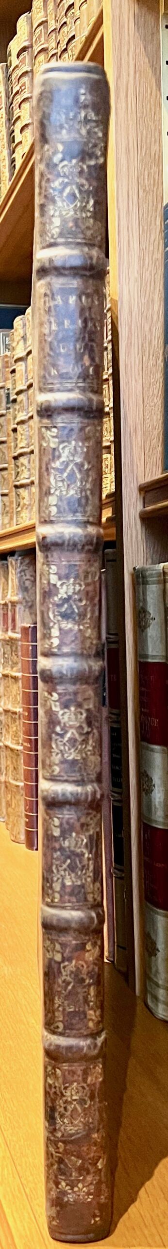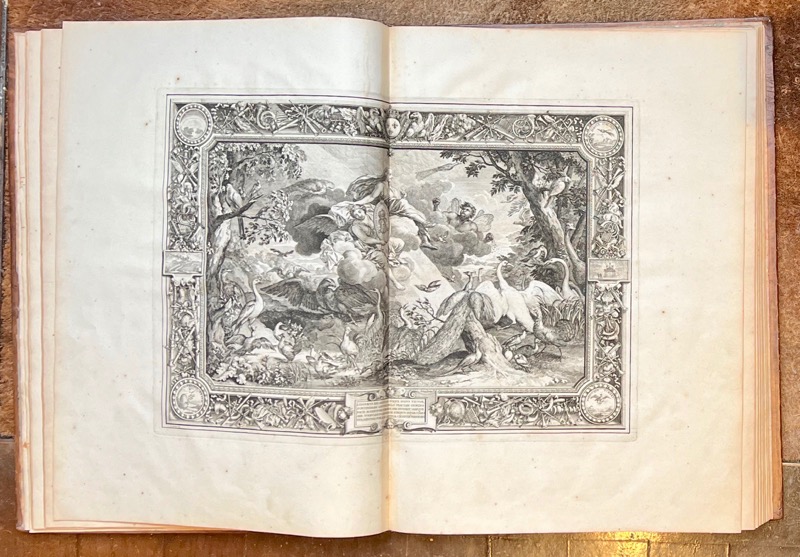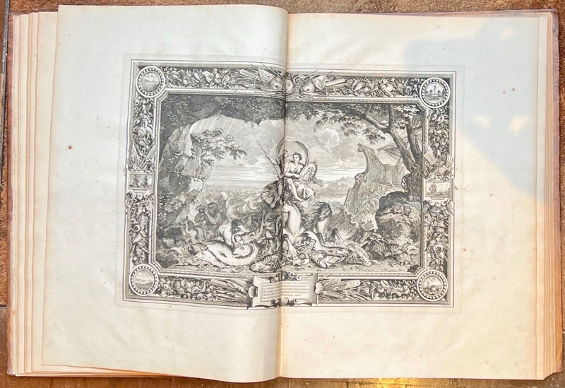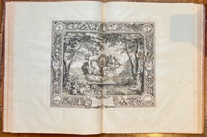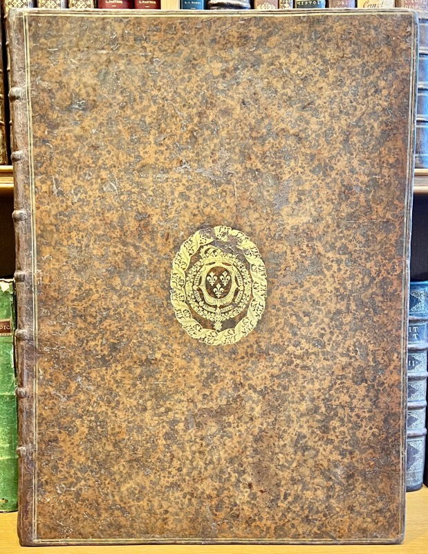 Première édition donnée par l’Imprimerie royale dirigée par Sébastien Mabre-Cramoisy de ce recueil d’estampes exécuté par ordre de Louis XIV pour célébrer sa gloire à travers les arts décoratifs, qui contient, pour la première fois, la description des tapisseries par André Félibien (1619-1695). Les devises et les quatrains explicatifs sont principalement de la main de Charles Perrault. L’illustration en premier tirage entièrement gravée sur cuivre contient 3 frontispices gravés par Sébastien Le Clerc d’après Jacques Bailly ; 8 planches à double page gravées par Sébastien Le Clerc et Jean Goyton d’après Jacques Bailly et Charles Le Brun, répartis selon deux cycles : le premier associe les vertus cardinales du roi aux quatre éléments, le second, les manifestations de son action au cycle des saisons, l’ensemble constituant un portrait allegorique de Louis XIV ; 32 figures d’emblèmes, accompagnés des vers français de Perrault, Chapelain, Charpentier, etc., au bas du médaillon ; fleurons, bandeaux, vignettes et lettres ornées, culs-de-lampe gravés par Sébastien Le Clerc et Bailly. Exemplaire complet des 4 grandes planches de la suite des tapisseries des grandes conquêtes du roi qui manquent le plus souvent, ajoutées à l’édition peu de temps après sa publication, dans le cadre de la programmation de la collection du Cabinet du roi, créé par le jeune Louis XIV qui voulait proclamer sans plus tarder sa puissance et sa gloire, et, dans ce but, faire connaître la somptuosité des fêtes qu’il donnait et les richesses de ses palais. C’est en 1663 que la petite académie qui venait d’être fondée par Colbert fut chargée de choisir les emblèmes, avec légendes appropriées, qui devaient figurer sur les tapisseries commandées par le roi pour ses appartements de Versailles. Ces emblèmes firent l’objet d’un luxueux manuscrit daté de 1668, pour le Cabinet du roi : 32 médaillons peints sur vélin par le miniaturiste Jacques Bailly et texte écrit par Nicolas Jarry. Le manuscrit fut l’objet de cette somptueuse édition avec des gravures en taille-douce par Le Brun et Sébastien Le Clerc. Provenance : Alfred Dailly (1818-1888), auditeur au Conseil d’état, fut administrateur de la Compagnie des chemins de fer de l’Ouest puis de l’hospice civil de Saint-Cloud, président de la Compagnie des Polders de l’Ouest. Bel exemplaire relié à l’époque aux armes et au chiffre de Louis XIV. Olivier-Hermal-Roton, pl. 2494, fers n°10 (armes 128 x 105 mm) et n°21 (chiffre). Coiffes et coins discrètement restaurés. Landwehr, 285 : « of the most somptuous edition of the Imprimerie royale » ; Brunet, I, 1443 ; Chatelain, Livres d’emblèmes et de devises, une anthologie (1531-1735), pp. 125-126 : « Constituant l’un des principaux recueils du Cabinet du roi, les Devises pour les tapisseries étaient essentiellement diffusées sous forme d’exemplaires de présent qui témoignaient de la munificence du roi et répandaient à travers le monde l’image de son prestige et de sa gloire » ; Lipperheide, 3757.