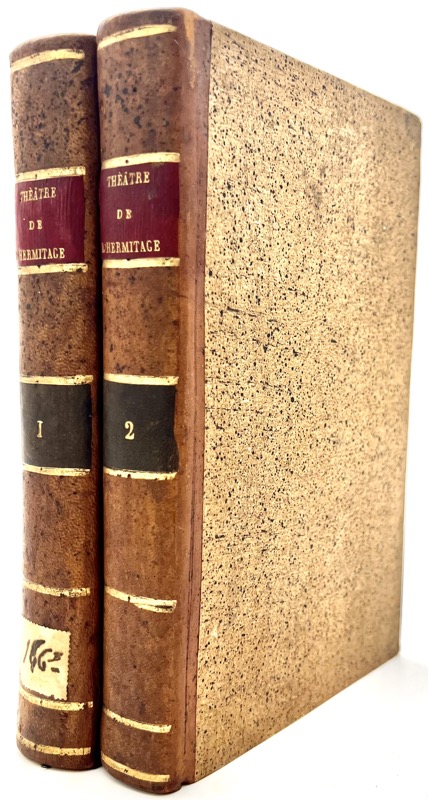 Première édition française publiée par Jean-Henri Castéra, partagée avec Buisson la même année. Selon Barbier, l’édition originale parut à Saint-Pétersbourg en 1788-1789. Les pages de titre des deux volumes précisent que « ces pièces ont été composées en langue française, et représentées par des acteurs français sur le théâtre particulier de l’impératrice, appelé l’Hermitage, devant cette princesse et sa société intime, à la fin de 1787 et dans l’hiver de 1788 ». Voir à ce propos le long article de Quérard. Différents auteurs apportèrent leur collaboration au théâtre de l’Hermitage ; Tome I : Le Tracassier ; Crispin, Duègne (par le comte Louis-Philippe Ségur) ; La Rage aux Proverbes ; Le Jaloux de Valence (par d’Estat) ; Le Flatteur et les Flattés ; Gros-Jean ou la Régimanie (par le comte de Cobentzel) ; Caius-Marcius Coriolan (par le comte Louis-Philippe Ségur) ; L’Insouciant (par Alexandre Momonof) ; L’Amant Ridicule (par le prince de Ligne). Tome II : Les Quiproquo ; Le Sourd et le Bègue (par le comte Louis-Philippe Ségur) ; Les Voyages de M. Bontems ; Insipidus (par Chouwalof) ; Il n’y a point de mal sans Bien ; L’Enlèvement (par le comte Louis-Philippe Ségur) ; La Matinée de l’Amateur (par le comte Strogonof) ; L’Officier Suffisant ou le Fat Puni (par Mlle Aufrène) ; L’Homme Inconsidéré (par le comte Louis-Philippe Ségur) ; Imitation de Schakespear (sic). Les pièces où l’auteur n’est pas précisé sont attribuées à Catherine II. Portrait de Catherine II en frontispice, gravé par Tardieu d’après Ferdinand de Meys. Très bon exemplaire. Barbier IV, 688 ; Quérard, Supercheries I, 659.