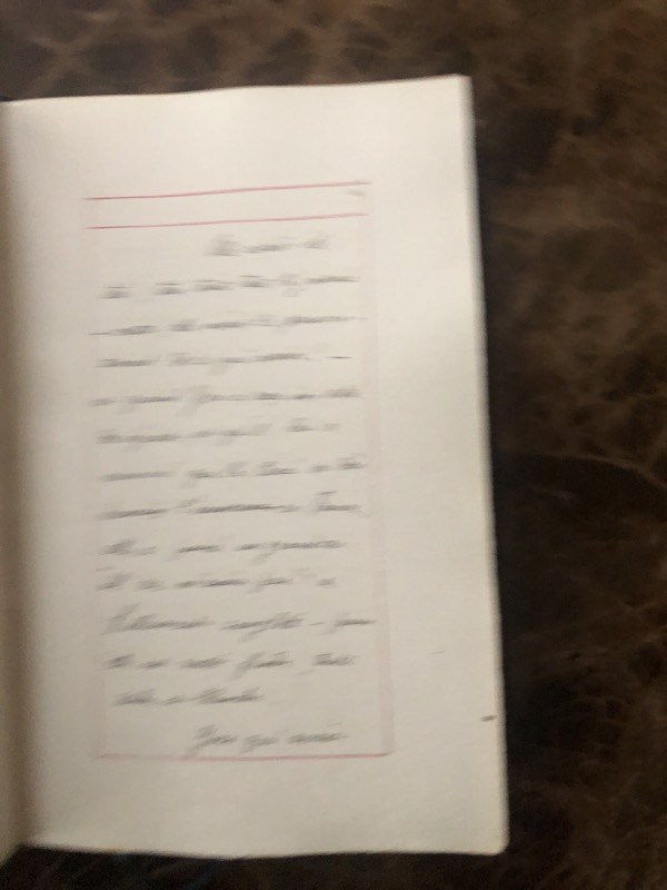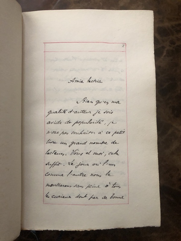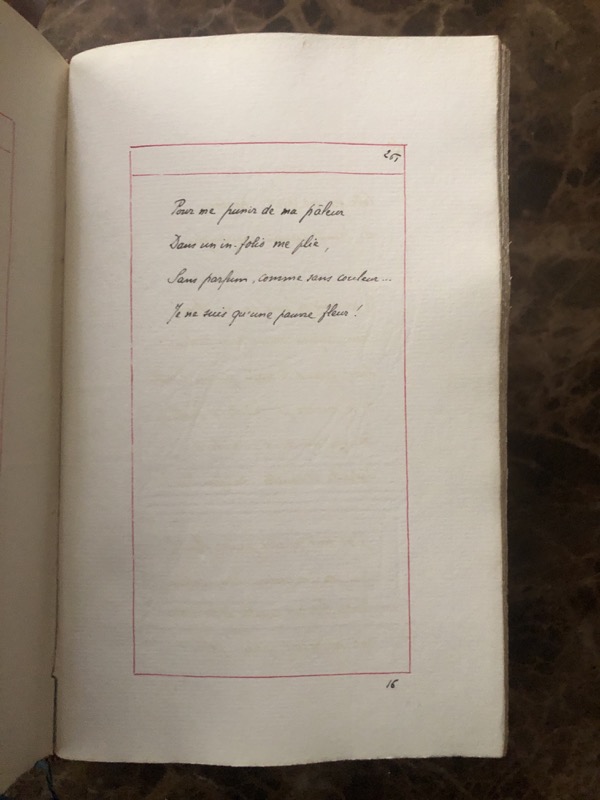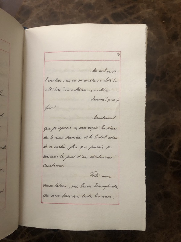 Manuscrit in-12 sur papier vergé de (2)-XXV-261 pp. encadrées d’un filet rouge, chagrin prune, dos à nerfs, titre et date à froid sur le dos, encadrement de filet à froid sur les plats, gardes moirées, tête dorée, non rogné (reliure de l’époque).