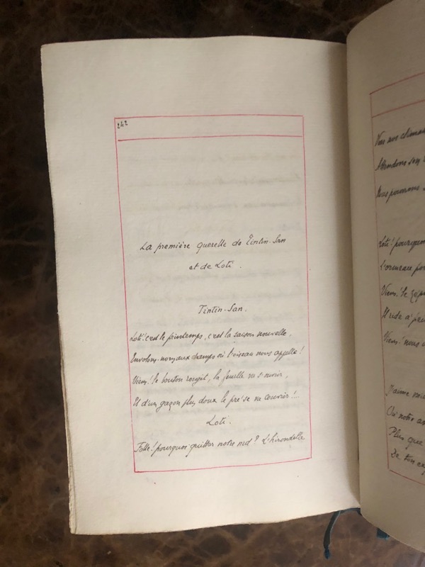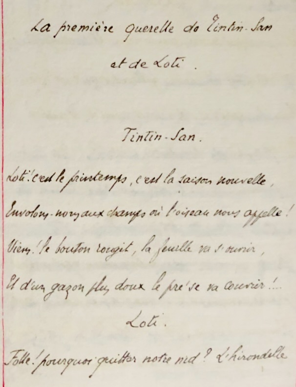 Cette œuvre anonyme, conçue comme une suite naturelle à Madame Chrysanthème de Pierre Loti (1887), s’inscrit dans le contexte de la vogue japonaise qui marque la fin du XIXe siècle en France. Rédigée dans un style mêlant prose et poésie, elle reprend les protagonistes du roman original, tout en introduisant de nouveaux éléments narratifs et thématiques. Une continuité littéraire et sentimentale. Le narrateur, identifiable comme Loti lui-même, évoque la genèse de cette suite dans une préface teintée d’une légèreté complice : « L’occasion c’est vous qui eûtes le privilège de la fournir : ce sont toujours les femmes qui mettent le feu aux poudres, c’est d’elles que part l’étincelle. Un livre de P. Loti que vous aviez lu vous plaît, vous désirez savoir s’il me plaira aussi, vous me le prêtez : le lendemain cet ouvrage avait une suite, Chrysanthème une rivale, Loti un nouvel amour… » Le récit conserve son cadre à Nagasaki, où les personnages du roman initial – Loti, son frère Yves, Chrysanthème, et Madame Prune – gravitent autour d’une nouvelle figure féminine, Tintin San, décrite comme une « mousmé » née en 1888. Ce terme, introduit en France par Loti, contribue à l’imagerie exotique qui séduisit le public français. Un jeu littéraire et poétique. La structure narrative se distingue par son dialogue entre prose et poésie. Cette alternance confère à l’œuvre une tonalité ludique et légère, tout en explorant les thèmes de l’amour éphémère et de l’exotisme. Une strophe emblématique traduit la fragilité des sentiments et des relations : Je ne suis qu’une pauvre fleur ; Sans parfum comme sans couleur ! Tintin San me cueille et m’oublie ! Loti me reçoit, puis – folie – Pour me punir de ma pâleur Dans un in-folio me plie, Sans parfum, comme sans couleur… Je ne suis qu’une pauvre fleur ! Une des premières manifestations de la mode japonaise. Cette œuvre, bien que mineure dans la production littéraire de son époque, illustre l’impact durable de Madame Chrysanthème sur la fascination française pour le Japon. En adoptant le prisme de la fantaisie amoureuse et en jouant sur les codes de l’exotisme, elle témoigne de la manière dont le roman de Loti a inspiré une série de créations littéraires et artistiques. Conclusion : entre hommage et parodie. Ce texte se situe à la croisée de l’hommage à Loti et de l’interprétation fantaisiste de son univers. Ancrée dans le japonisme fin-de-siècle, cette suite anonyme prolonge les aventures sentimentales du narrateur, tout en participant à l’élaboration d’une image idéalisée et romancée du Japon, qui allait marquer durablement l’imaginaire collectif européen.