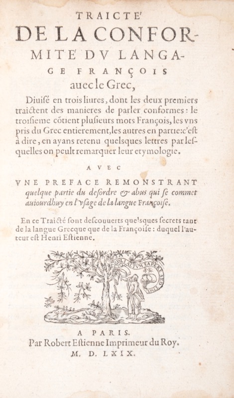 Deuxième édition fort augmentée du grand traité d’Henri Estienne pour la défense de la langue française, premier ouvrage qu’il écrivit en français. Son propos est de montrer la supériorité du français sur toutes les autres langues, le grec mis à part. Henri Estienne n’en excepte même pas le latin qu’il juge moins riche et moins souple que le français ; il a sur ce point une véritable doctrine qu’il a ramenée à un syllogisme rigoureux : 1° il n’y a pas eu et il n’y aura jamais de plus belle langue que le grec, 2° or, le français est de toutes les autres langues celle qui se rapproche le plus du grec, 3° donc, le français est supérieur à toute les langues modernes. Provenance : Ambroise Firmin-Didot ; Catalogue des livres précieux de Ambroise Firmin-Didot (1883), n°212 : « Très bel exemplaire » ; ex-libris « Raoul Baguenault de Puchesse » (1876-1945). Brunet II, 1075 ; Renouard, 171/4 ; En français dans le texte, 62 (pour l’édition originale) ; Schreiber, 240.