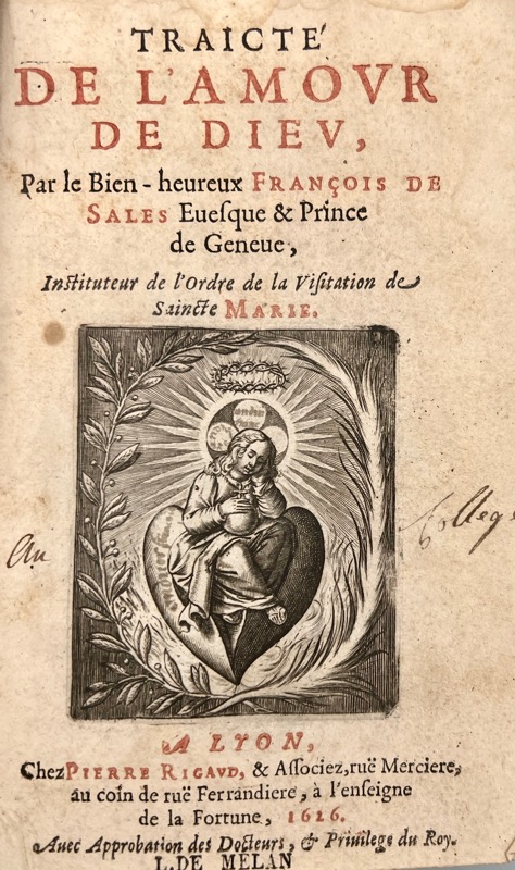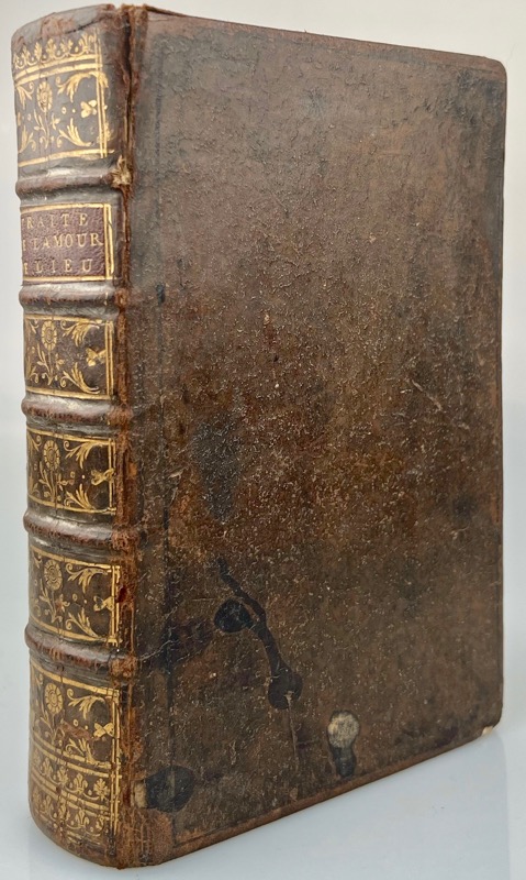 Nouvelle édition sortie des presses de Bertrand Teste-Fort (colophon) à l’adresse de Pierre Rigaud qui publia l’édition originale en 1616. Le traité, accueilli avec enthousiasme et réédité plusieurs fois dès 1617, ne connut pas cependant le succès de l’Introduction. En dehors des débats qu’il suscita à la fin du siècle entre jansénistes, quiétistes et Bossuet, et de la suspicion qui rejaillit ainsi sur lui, il offrait une doctrine spirituelle plus savante et moins grand public que l’Introduction : « pour en bien connaître le prix » disait Vaugelas, « il faut être à la fois fort dévotieux et fort docte, qui sont deux qualités bien rares étant séparées et plus rares encore étant conjointes » (Jacqueline Artier, in Catalogue de cent un livres anciens rares ou précieux de la Bibliothèque de la Sorbonne, n°69). Portrait de François de Sales gravé en regard de la préface (feuillet a8) ; titre rouge et noir ornée d’une vignette gravée au Sacré Coeur. Cachet « L. de Melan » aux titre et colophon, avec l’ex-libris « E Bibliotheca PP. in Societatis Jesu Dom. Prob. Melan » : la Chartreuse de Mélan fut fondée par Béatrix de Faucigny, fille de Pierre comte de Savoie, et épouse de Guigues IV, Dauphin de Viennois, en 1292, et accueillie quarante religieuses et sept prêtres réguliers et devint le lieu de sépulture de Béatrix et des dauphins successeurs. Supprimée en 1791, elle fut la propriété des jésuites de 1818 à 1848, puis par la suite à l’évêque d’Annecy. Pâles rousseurs, coins frottés, mors supérieur fendu en tête. Brunet, V, 73 ; Arbour, L’ère baroque en France : répertoire chronologique des éditions de textes littéraires, II, n°12207.