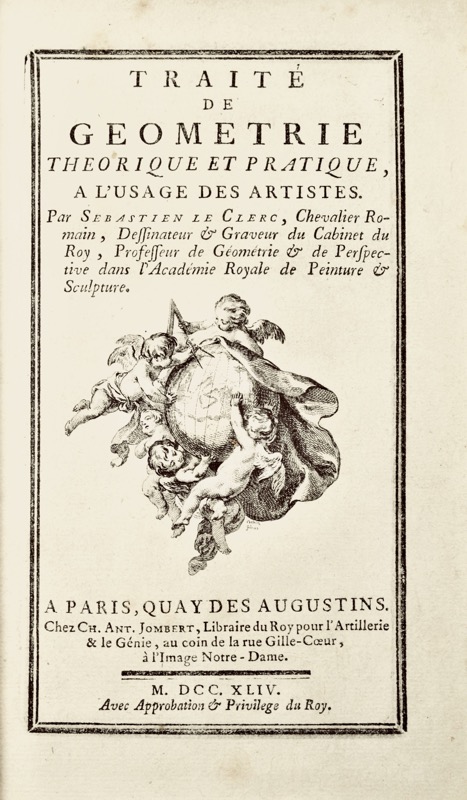 Nouvelle édition du traité très populaire de Sébastien Leclerc (1637-1714) établi ici pour la première fois par Charles-Antoine Jombert. L’édition originale a paru en 1669. L’illustration comprend 1 fleuron sur le titre, 1 vignette, 1 cul-de-lampe par Cochin fils, non signés et 45 planches de géométrie au bas de chacune desquelles se trouve une vignette de Cochin fils et de Chedel, gravée par l’un ou l’autre. Bel exemplaire dans une reliure en maroquin rouge signée Michel Engel. Pâles rousseurs. Cohen-de-Ricci, 611; Brunet, III, 915 (édition originale de 1669).