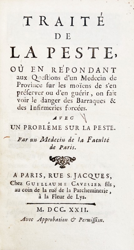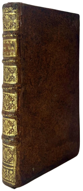 Édition originale du traité sur la peste de Philippe Hecquet (Abbeville 1661 – Paris 1737) qui signe l’épître : « (…) j’ose vous présenter, Monsieur, les différentes méthodes de traiter cette maladie (…) je n’ai point craint de conserver à la saignée la valeur que lui ont donné les grands auteurs qui l’ont pratiqué avec succès dans la peste. » À l’époque, on pensait que la peste était provoquée par des miasmes, des vapeurs putrides rendues délétères en raison de la position des astres. Proche des jansénistes, médecin des princes et médecin des pauvres, Hecquet vivait très sobrement, mangeant peu et ne buvant que de l’eau. Champion de la saignée, il ne manque pas de s’attirer les satires et aurait inspiré à Lesage le personnage du docteur Sangrado (saignée en espagnol) de Gil Blas, et celui de Hocquetos. Provenance : Raymond Decary (ex libris) ethnologue et géographe, spécialiste de Madagascar (1891-1973) ; cachet « Alain Weiss Ingénieur ». Très bon exemplaire en reliure d’époque. Waller, 4179 ; Blake 202.