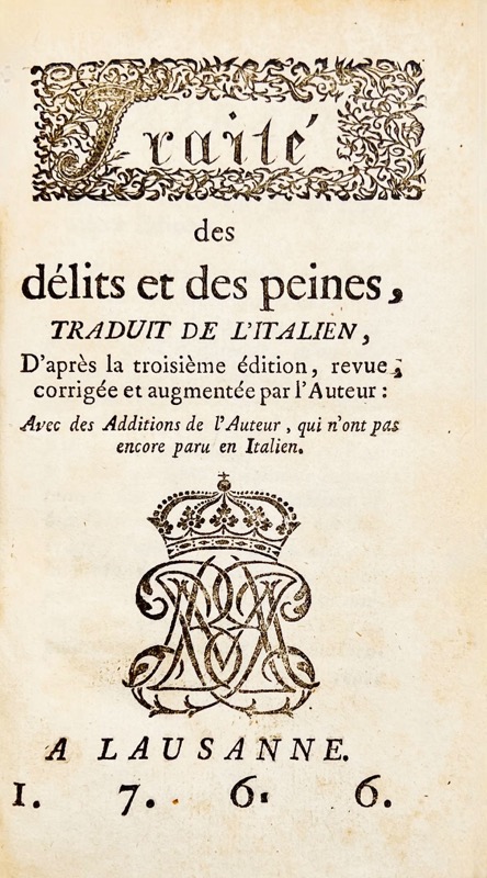 ![BECCARIA (Cesare). Traité des délits et des peines, Traduit de l'Italien, D'après la troisième édition, revue, corrigée et augmentée par l'Auteur : Avec des Additions de l'Auteur, qui n'ont pas encore paru en Italien. A Lausanne, 1766. In-12 de XXXI-(1)-242 pp. [MALETESTE, Jean-Louis de]. Lettre au traducteur de l'ouvrage italien Dei Delleti e delle Pene.](https://bonnefoi-livres-anciens.com/wp-content/uploads/2026/02/44455_1.jpg)
