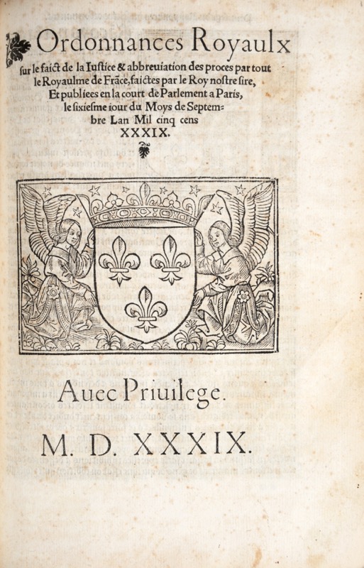 ![[Villers-Cotterêts. Acte royal. 1539]. Ordonnances Royaulx sur le faict de la justice & abbreviation des procès par tout le Royaulme de France, faictes par le Roy nostre sire, et publiées en la court de parlement à Paris, le sixiesme jour du moys de septembre l'an mil cinq cens XXXIX. Avec Privilège. – Image 2](https://bonnefoi-livres-anciens.com/wp-content/uploads/2025/08/42759_2.jpg)