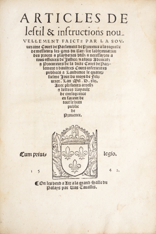 In-4 gothique de (24) ff. (sign. a-f4). Relié avec : 2. [Provence. Ordonnances]. Ordonnances du très chrestien Roy de France Françoys premier de ce nom réduictes par tiltres & articles & ordre selon les matières ordonnées estre gardées & observées en ces pays de Provence, Forcalquier & terres adiacentes selon s’en ensuyvant la réformation par luy faicte sur le faict de la iustice desdictz pays lan mil cinq cens trente cinq (….). Avignon, Jean de Channey, août 1536. In-4 gothique de CV-(9) ff. (sign. A-T6), table, titre dans un encadrement gravé. 3. [Provence. Articles]. Articles de lestil & instructions nouvellement faictz par la souveraine court de Parlement de Provence à la requeste de messieurs les gens du Roy, sur labbréviation des procès & playderies utilz & nécessayres a tous officiers de justice & a tous advocatz & procureurs de ladicte Court de Parlement & daultres Cours inférieures, publiées à l’audience le quatorziesme jour du moys de febvrier. Lan mil D. XLII. Avec plusieurs arrestz & lettres royaulx de conséquence en faveur de tout le bien public de Provence. Cum privilegio. On les vend à Aix en la grand salle du Palays par Vas Cavallis 1542. In-4 gothique de 16 ff. (sig. A-D4), armes de France au titre, bois représentant saint Louis au verso du titre. Les trois pièces reliées en 1 vol. in-4, vélin dur, dos à nerfs, titre manuscrit à l’encre noire sur le dos, triple filet d’encadrement et fleur de lys à froid dans les angles (reliure de l’époque).