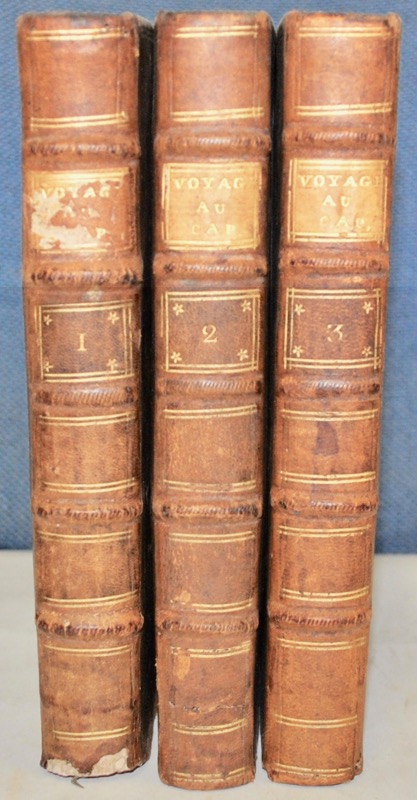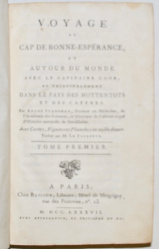 Première édition française établie par Letourneur publiée la même année au format in-4, illustrée d’une grande carte repliée du Cap et 16 planches dont une Vue des environs du Cap de Bonne-Espérance repliée en frontispice. Relation du voyage en Afrique du Sud du naturaliste suédois et élève de Linné Anders Erikson Sparrman (1748-1820) qui accompagna après leur rencontre au cap de Bonne-Espérance, le capitaine James Cook et les naturalistes Reinhold et Georg Forster dans leur voyage autour du monde, en qualité de botaniste. Il participa ainsi à l’expédition de novembre 1772 à mars 1775. À son retour au Cap, il entreprit la dangereuse exploration des terres sauvages de l’Afrique du Sud. L’ouvrage contient un vocabulaire de la langue des Hottentots et des Cafres. L’édition originale parut à Stockholm en 1783. Traces de frottement, épidermures, coiffe de pied usée au tome I. Provenance : bibliothèque du Marquis de Vichy avec ex-libris armorié. Brunet V, 474 ; Chadenat, 702 ; Gay, n°3125