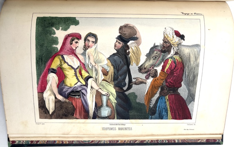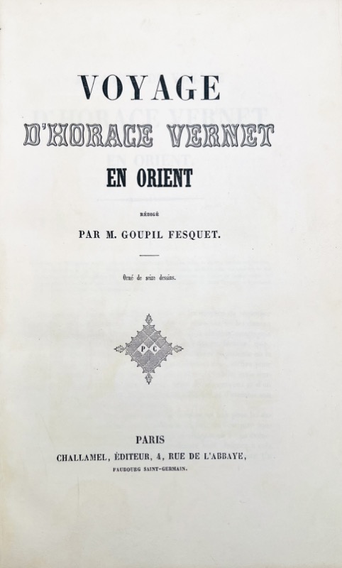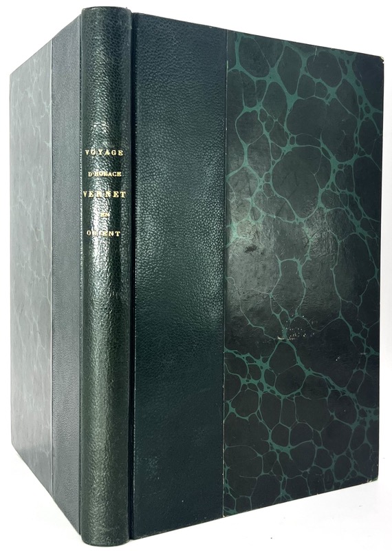 Premier tirage de cet ouvrage publié en 20 livraisons. Goupil-Fesquet, connu pour ses ouvrages de peinture et de sculpture, voyagea en compagnie de Horace Vernet vers 1840 en Égypte, en Palestine et en Syrie, traversant la Crète et Smyrne. Bel exemplaire orné de seize lithographies coloriées de Goupil Fesquet dont un frontispice. Thivet fut relieur établi au 10 de la rue des Poitevins à Paris ; il exerçait durant le dernier tiers du XIXe siècle (Fléty p. 168). Quelques rousseurs. Carteret III, 594 ; Blackmer, 637.