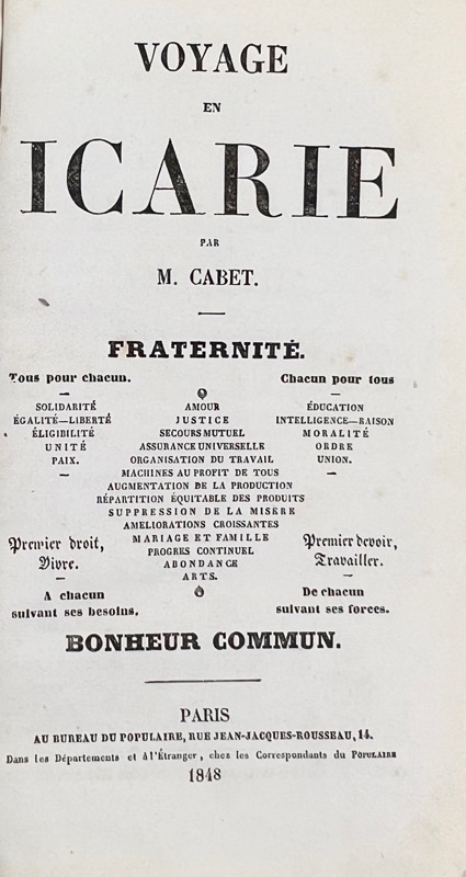 Théoricien du communisme icarien, réformiste et expérimental, Étienne Cabet (Dijon 1788 – Saint-Louis USA, 1856), mit en pratique ses théories en fondant à Nauvoo dans l’Indiana une colonie communiste comptant près de 2.000 colons. Très bon exemplaire.