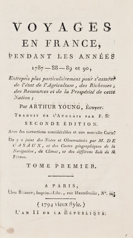 Deuxième édition française augmentée, traduite par F. Soulès, avec des notes de Cazaux. Deux cartes repliées, dont une coloriée. C’est en 1787, sur l’invitation de son ami Lazowski, que Arthur Young entreprit son premier voyage en France. Il en accomplira trois au total, en 1787, en 1788 et en 1789 -1790, au cours desquels il recueillera de nombreux renseignements qui lui permettent de composer ses Travels in France (1792), traduits en français dès 1793. Il assista aux débuts de la Révolution de 1789, dont il approuva les réformes mais dont il condamna la violence ; il lui devint hostile après le 10 août 1792. Son Voyage en France est considéré aujourd’hui comme un des tableaux les plus fidèles de la France et de l’agriculture française à la fin de l’Ancien régime. Très bon exemplaire. Musset-Pathay, 2045 ; Kress, B.2638 ; Fierro, 1499 ; pas dans Einaudi.