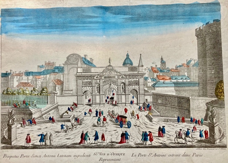 Gravure en perspective ou « vue d’optique » représentant la Porte St Antoine entrant dans Paris avec un détail des tours de la Bastille sur la droite de l’estampe. Titre parallèle : Prospectus Portae Sancti Antonii Lutetiam ingredienti. On utilisait pour contempler l’estampe un zograscope qui créait l’illusion du relief.