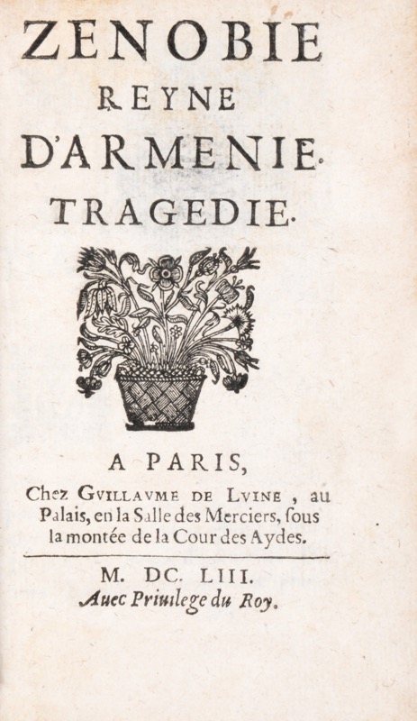 Édition originale adaptée de La Gran Zenobia de Pedro Calderón de la Barca. « Homme d’esprit et d’un commerce agréable, Jacques Pousset était ami de Le Royer de Prade et de Chapelle ; de Molière aussi qui joua certaines de ses pièces de théâtre » (Grente). Jacques Pousset de Montauban (Le Mans 1610?-1685), avocat et jurisconsulte à Paris, plaida plusieurs causes célèbres dont celle de la duchesse d’Aiguillon dans la succession de Richelieu. Bel exemplaire en vélin d’époque. Cioranescu, III, 55482.